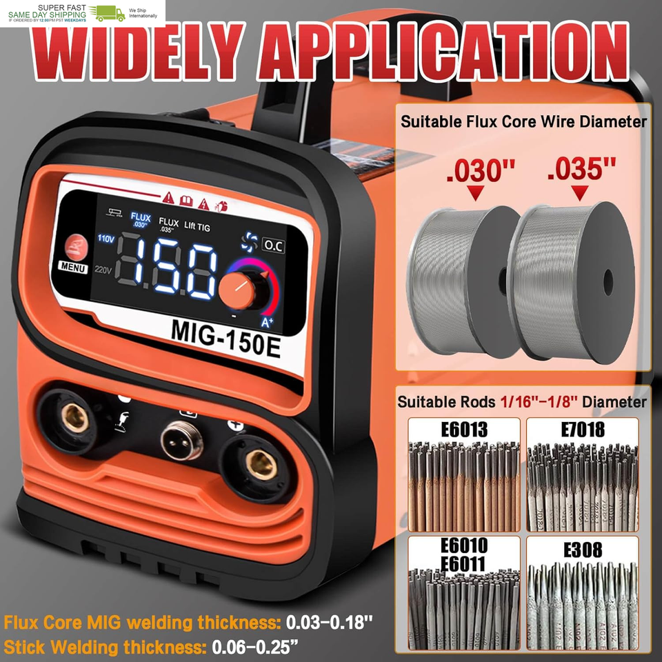 The welding machine great for AWS E6013, E7018, E6011, E6010, E308 1/16"-1/8"(1.6mm-3.2mm) welding rods can weld all kinds of metal. By precisely controlling the different types of welding rods, the Flux Core MIG welder is able to provide high-quality welding results and ensure strong welds.