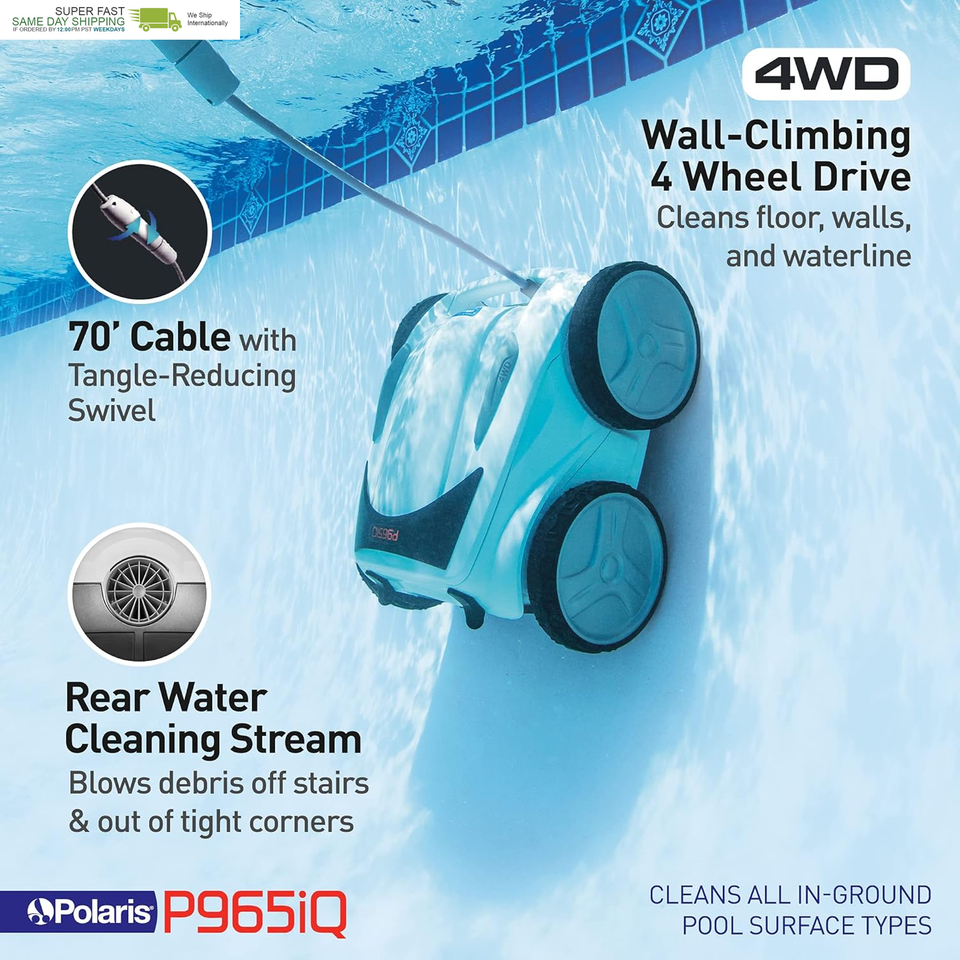 The Polaris P965iQ Sport is a 4WD robotic pool cleaner that provides premium cleaning performance with the ultimate convenience of iAquaLink app control and the ability to start the cleaner up when it?s in the pool by simply asking Alexa. By connecting to your home?s WiFi network, the P965iQ Sport allows anytime, anywhere access to real-time scheduling programming, and troubleshooting from your smart device.