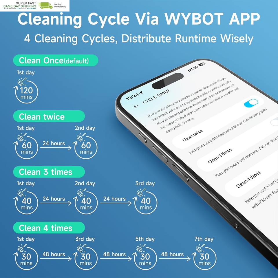 App Control OTA Upgrades: With the WYBOT mobile app, easily schedule, monitor, and customize cleaning sessions remotely. Enjoy ongoing feature enhancements with OTA (Over-the-Air) software updates, including 4 cleaning cycle options and smart runtime distribution?giving you greater control and a better user experience.