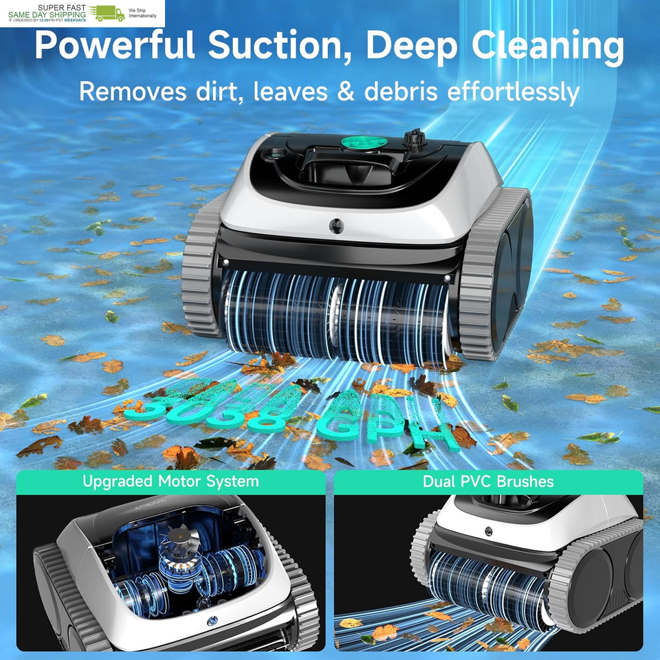 Powerful Suction Dual Brushes : Engineered with an upgraded independent water pump motor delivering up to 3,038 GPH of filtration power. Equipped with dual high-adhesion PVC brushes, the cleaner effectively tackles debris, leaves, sand, and stubborn dirt on all pool surfaces