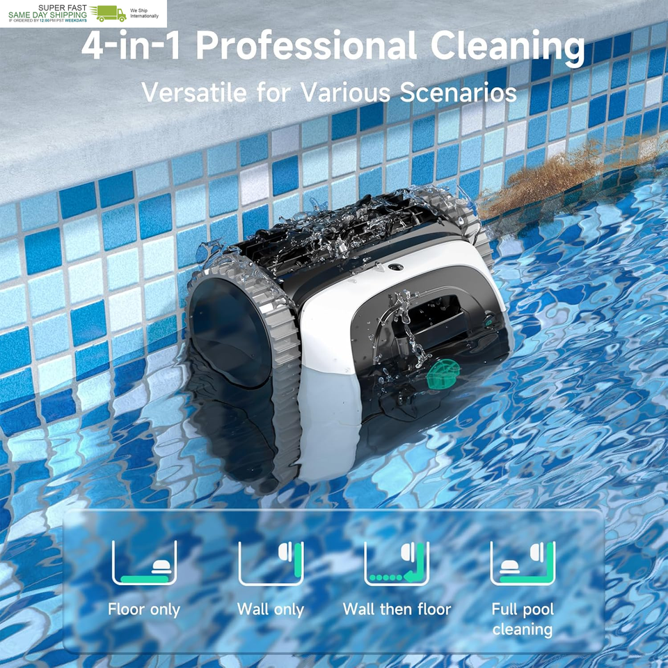 Advanced Navigation 4WD Traction: Featuring a smart gyroscope-based navigation system, the cleaner follows an N-path along walls and an S-path on the pool floor, achieving optimized route planning. Combined with four-wheel-drive (4WD), upgraded motors, and PVC traction brushes, it adapts to different pool surfaces such as tile, vinyl, pebble, glass, and mosaic
