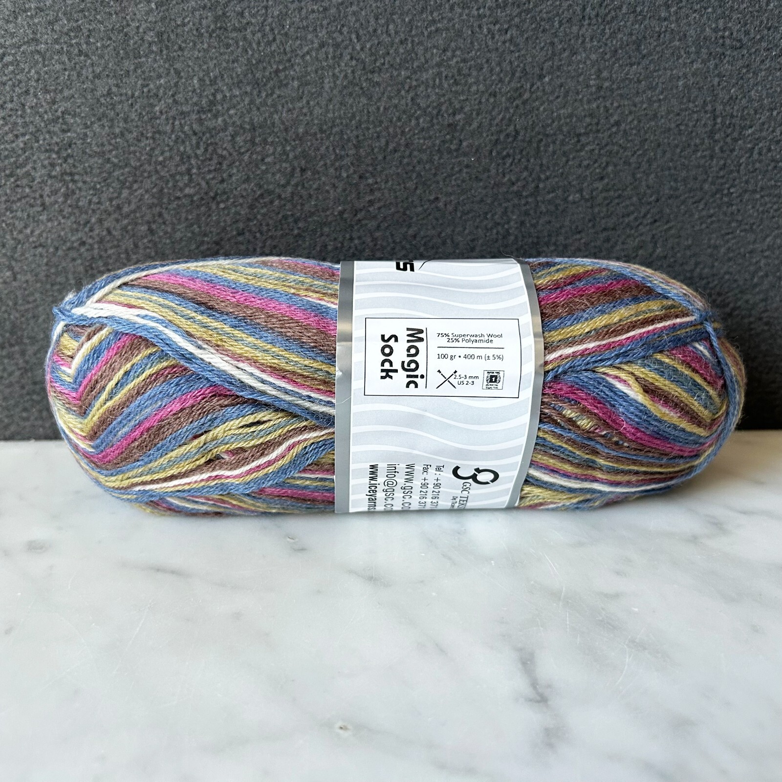 One ball/skein of Ice Yarns Magic Socks self-striping yarn. Variegated colors: Blue, Purple, Green and Brown. 75% Superwash Wool, 25% Nylon/Polyamide; machine wash and dry.