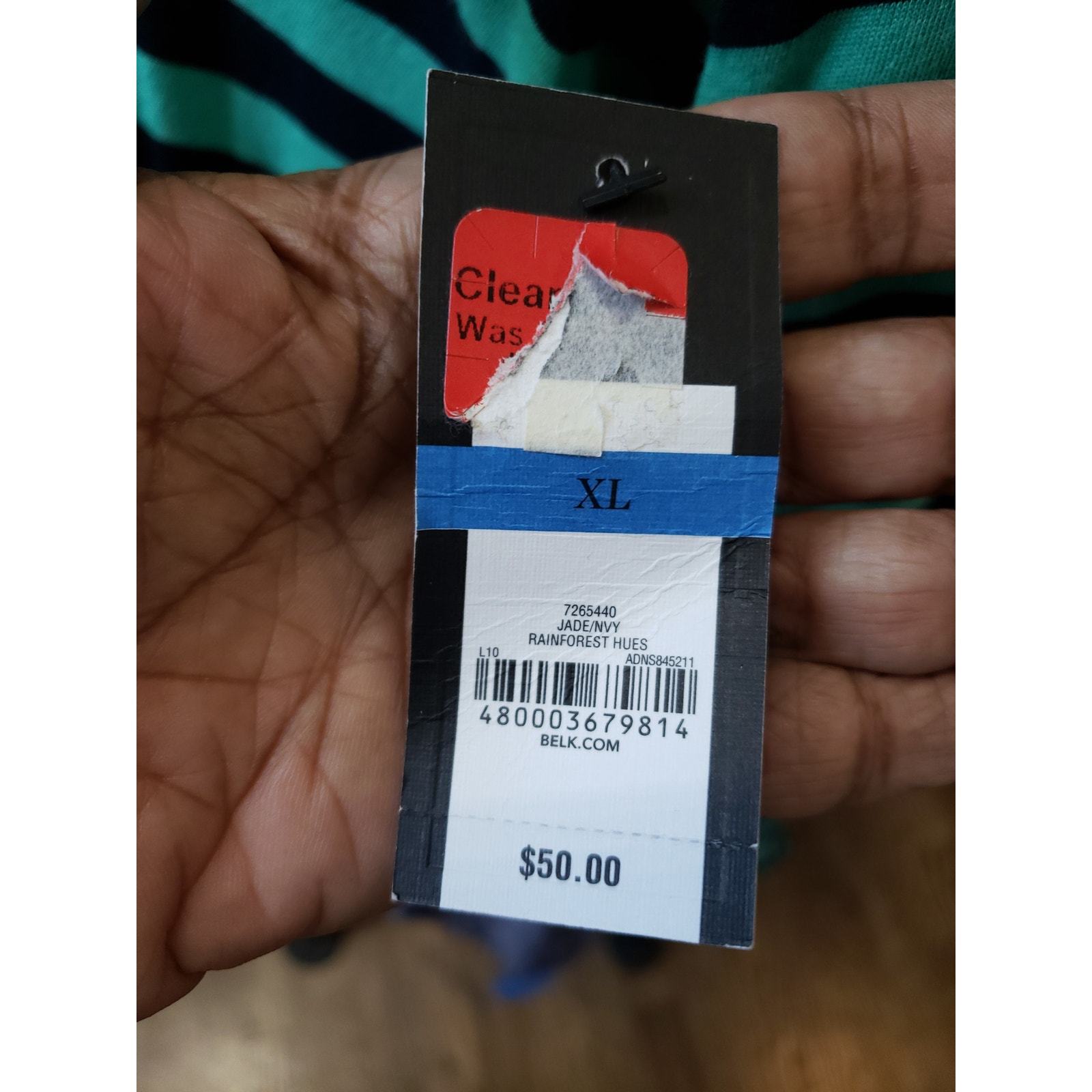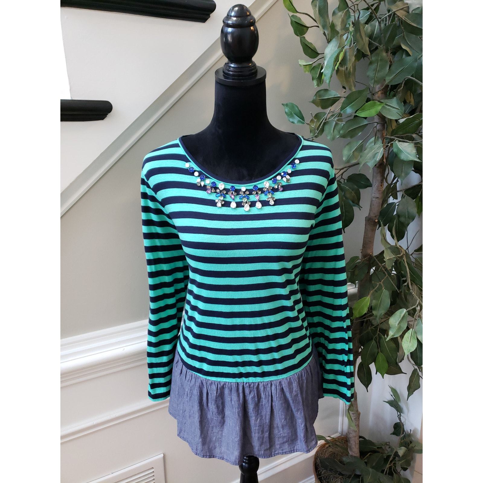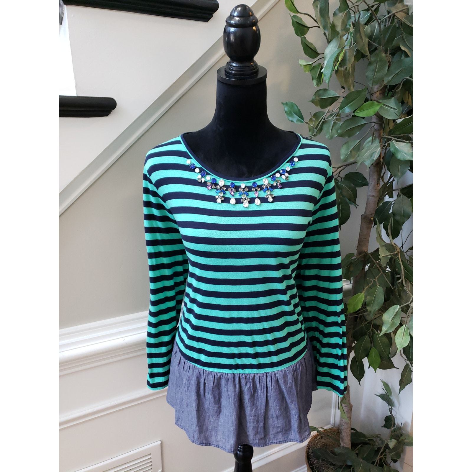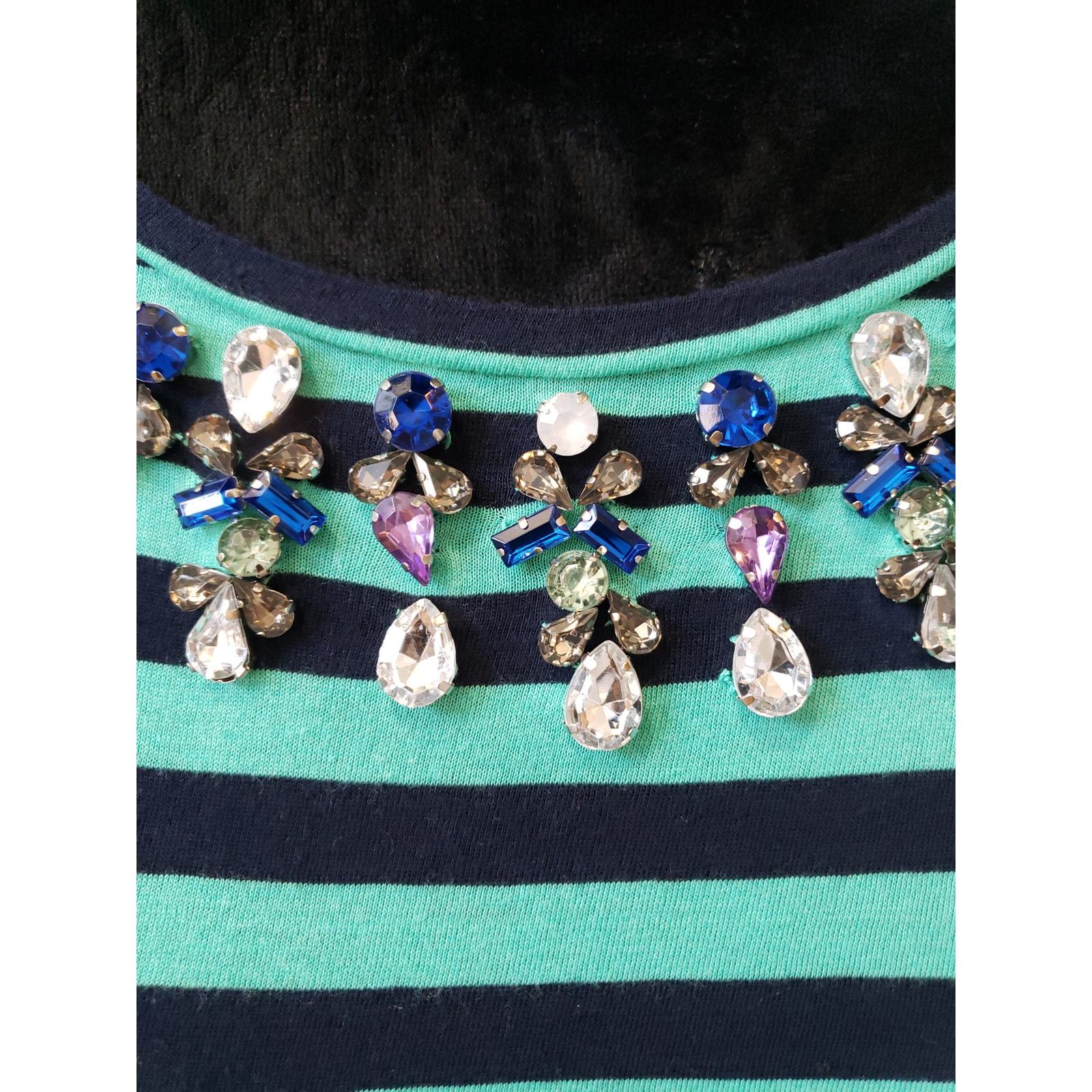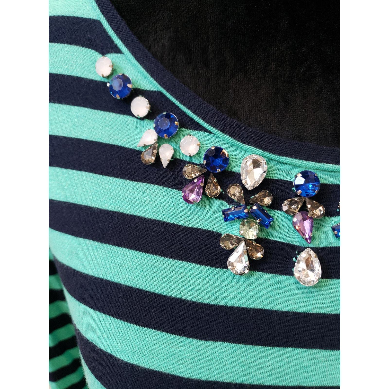 Color: Green and Navy Stripes with a Jeweled Neckline
