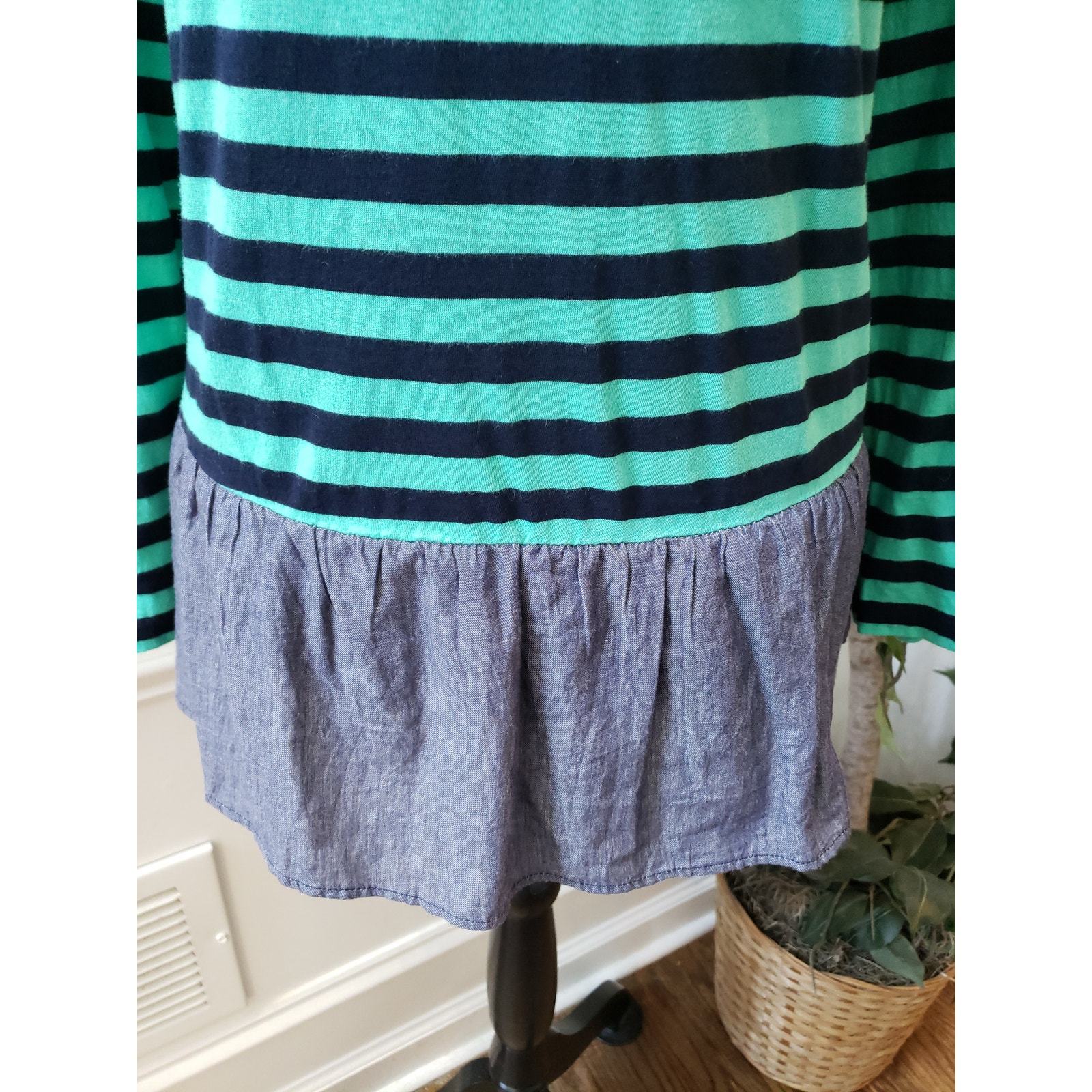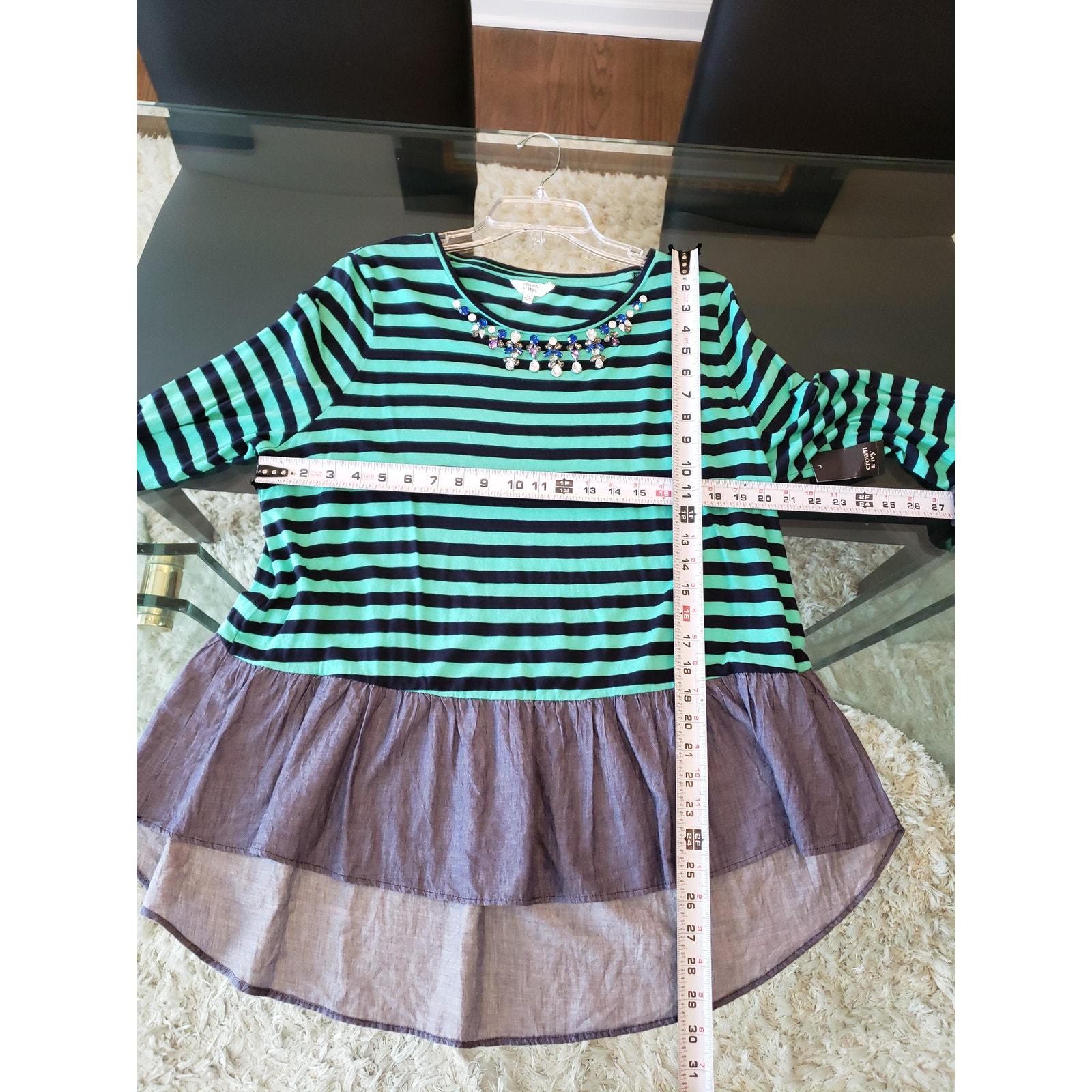 This Women's Crown Ivy striped long sleeve top in size XL features a chic green and navy striped design with a playful ruffled bottom. The top is adorned with a jeweled neckline for a touch of elegance, making it perfect for both casual and dressy occasions. The lightweight fabric ensures comfort, while the relaxed fit provides a flattering silhouette. Pair it with jeans or skirts for a versatile and stylish look.