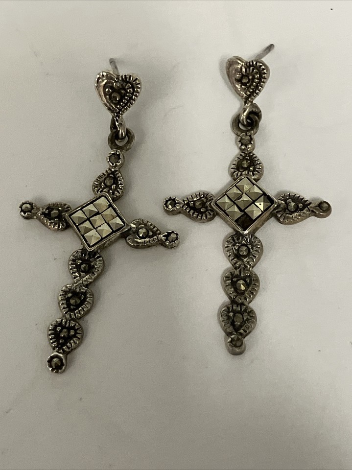 Sterling Silver Gothic Marcasite Cross Crucifix Dangle Earrings Set