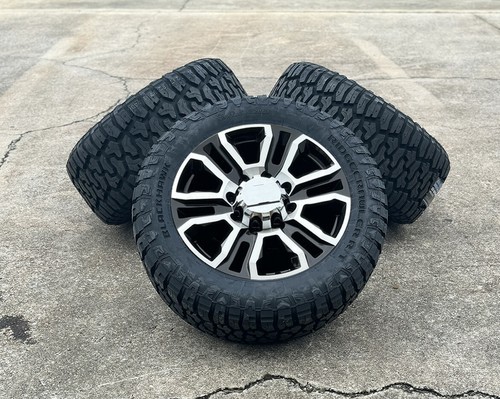New Set Of Four GM Style Replica 20" 8 lug (8-180 bolt pattern) Black And Machine Split Spoke Wheels With Blackhawk Ridgecrawler R/T 33x12.50R20 Tires for 2011-2025 Chevy Silverado 2500 or 3500 and Suburban 2500.