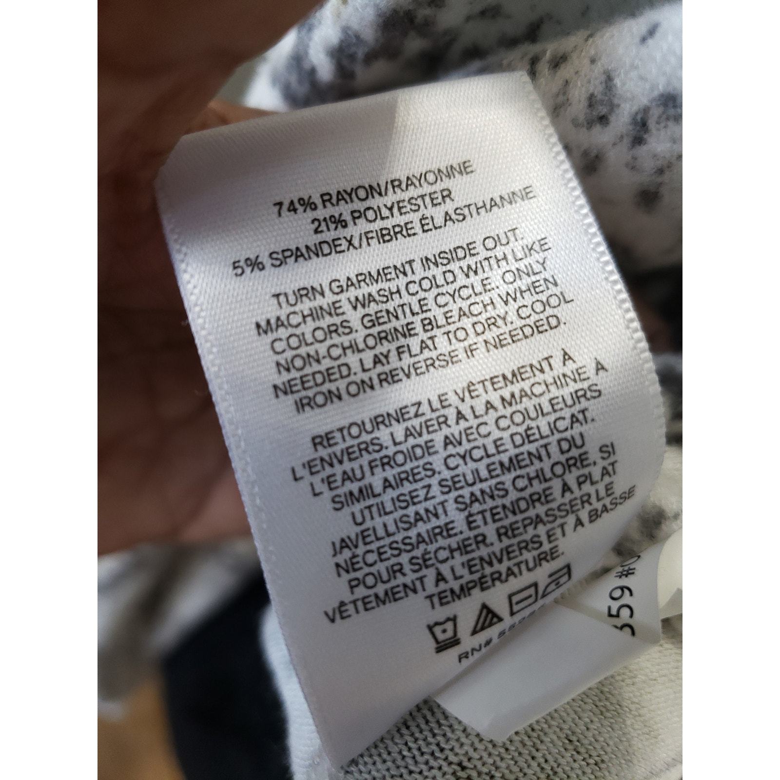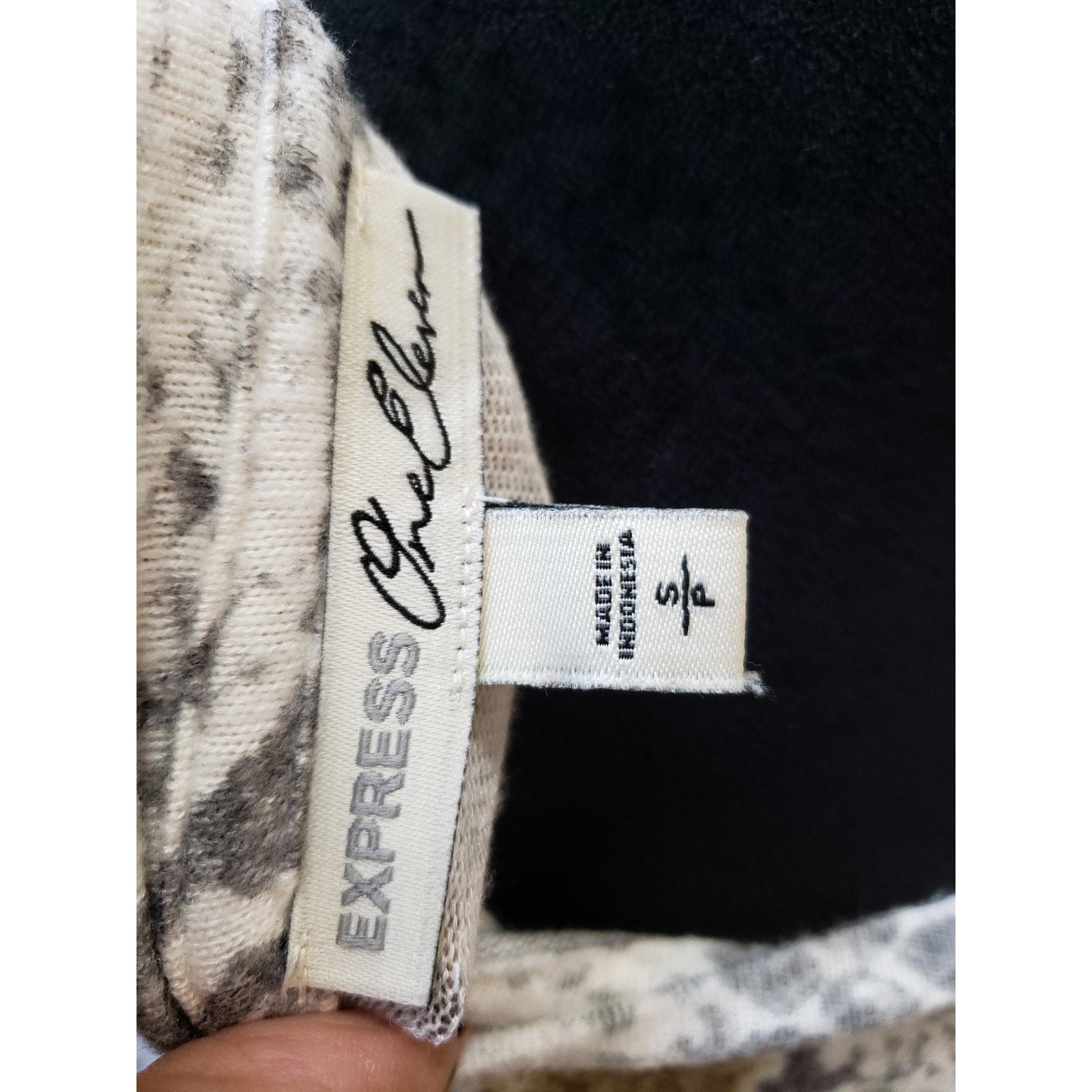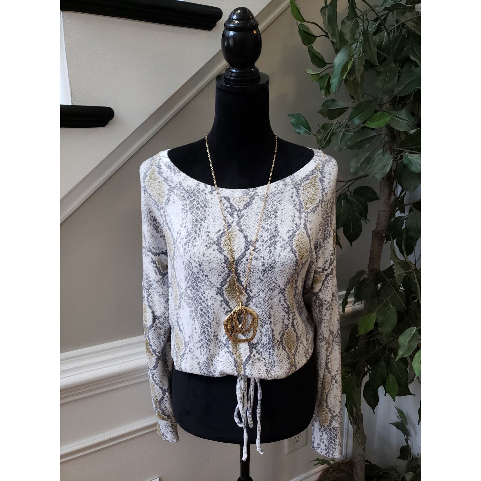 This Women's Express long sleeve top in size S features a stylish snake print design in neutral tones of white, gray, and gold. The top is made from a soft and stretchy fabric that provides comfort while maintaining a fitted look. With its trendy design, featuring a cinched waist and long sleeves, it can be easily paired with jeans or skirts for a casual yet chic outfit. Perfect for those who love fashionable and statement-making pieces.