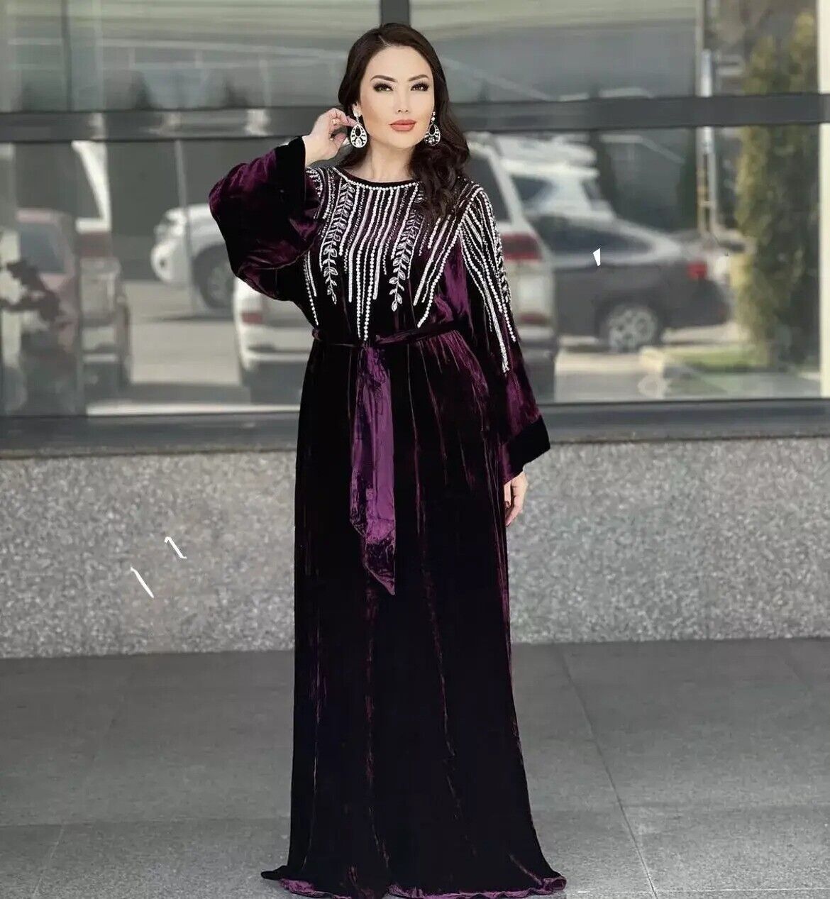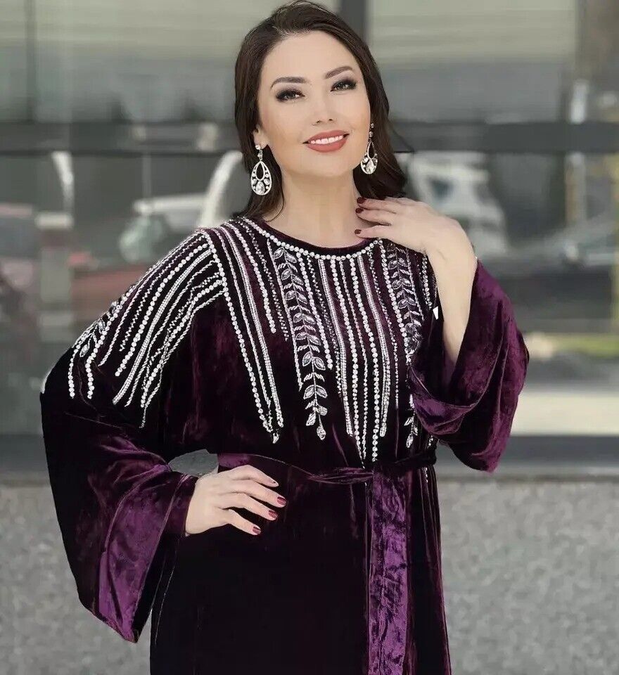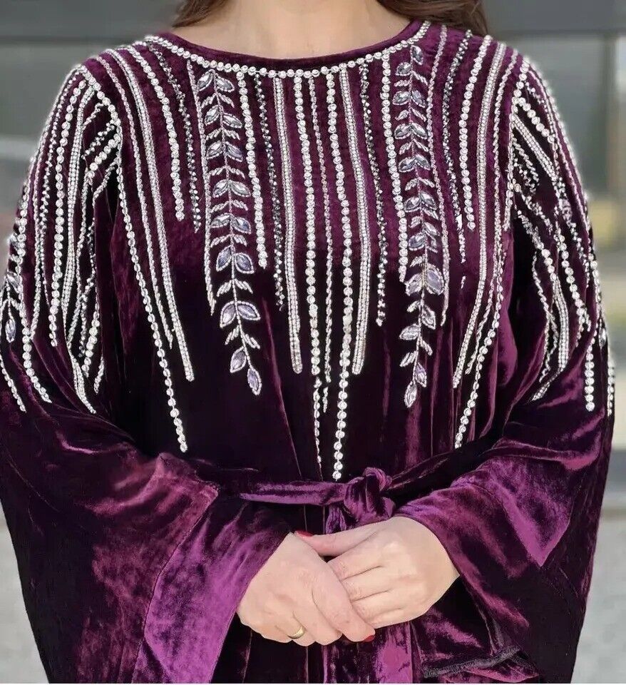 Stylish Long Moroccan Dubai Farasha Wine Kaftan Hand Work Crystal Abaya Dress/ SU