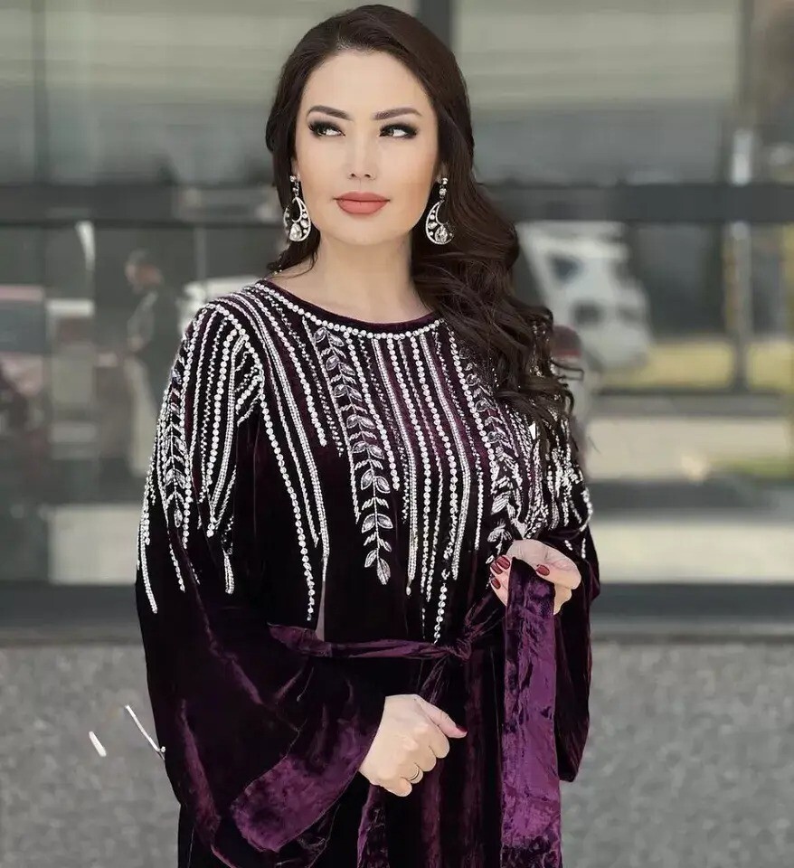 Stylish Long Moroccan Dubai Farasha Wine Kaftan Hand Work Crystal Abaya Dress