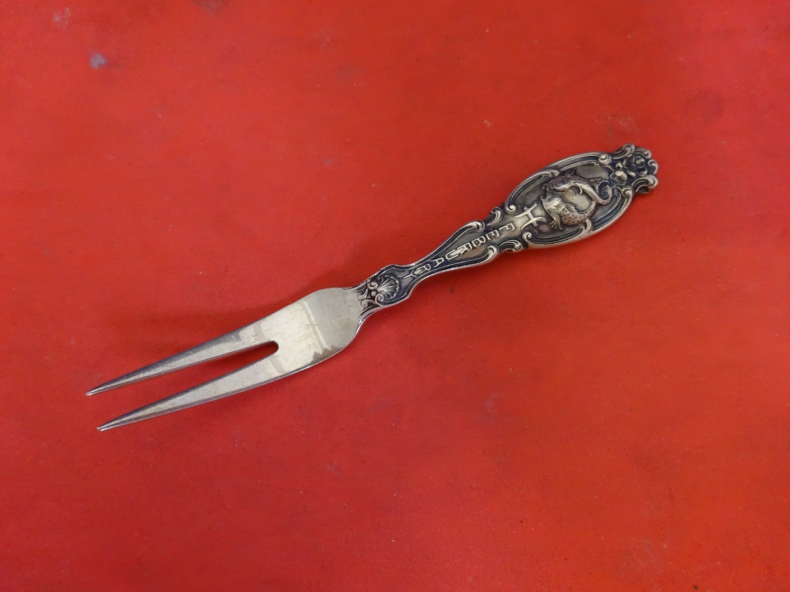 Sterling silver Strawberry Fork, Pisces February, 3 3/4" in the pattern Zodiac By Gorham. It is not monogrammed and is in excellent condition.