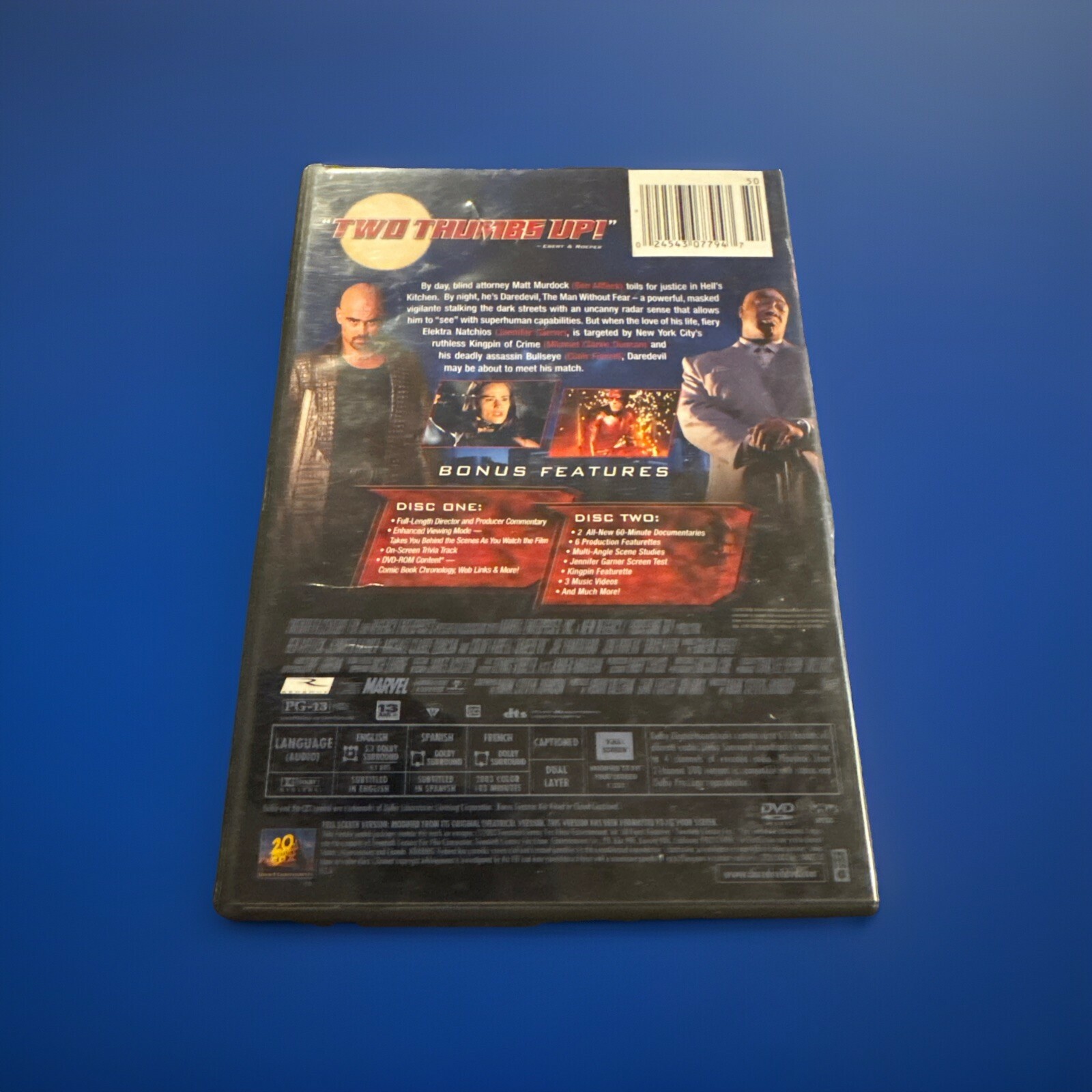 Experience the thrilling world of "Daredevil" with this 2-disc DVD set in full screen. Starring Ben Affleck and Jennifer Garner, this special edition features the action-packed superhero in all his glory. The set includes the full-length movie in English, with a rating of PG-13, making it suitable for the whole family.