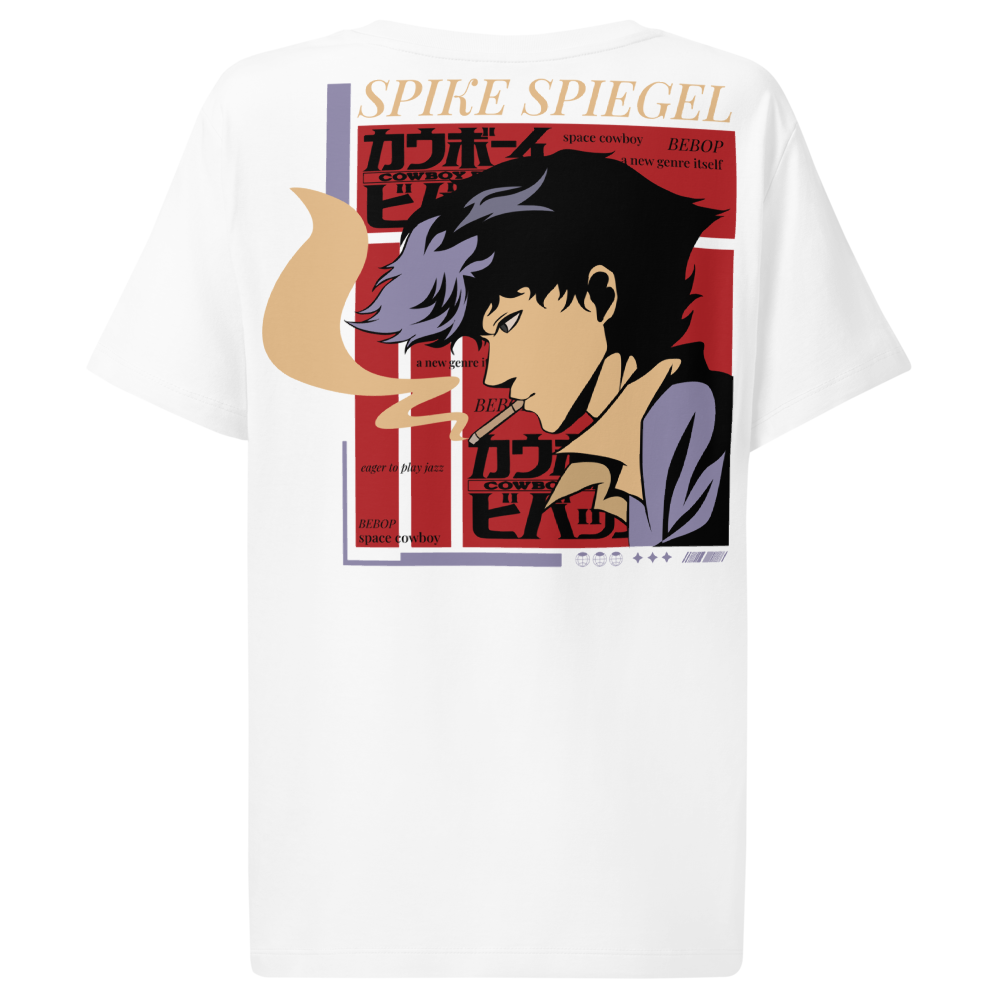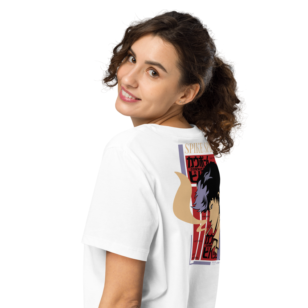 Show off your love for iconic style with this white women’s organic tee featuring a bold Spike Spiegel back print. The flattering cut and ribbed neckline deliver an elevated everyday look, while the 100% organic cotton provides breathable, planet-conscious comfort.