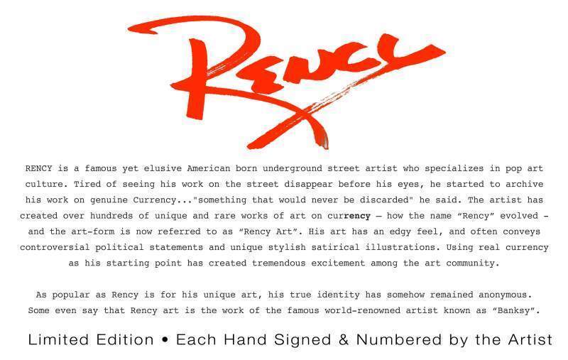 Another beauty from RENCY. The colors are vibrant. The Giclee $2 Bill is in perfect condition and comes in a clear display holder (6"x3"). One of Rency's best work to date as bill featuring MICHAEL PHELPS. The Bill Features Michael Phelps "the Swimmer" and Michael Phelps face as the superhero "AQUA-MAN". It Features the #28 for the total medals won by Phelps and the #23 for the number of GOLD OLYMPIC MEDALS won by Phelps. Rency captures the 2016 Rio Olympics and one of the USA's Greatest swimmer ever. Features the famous Michael Phelps Quote: "the more you dream...the farther your get". Historic Celebration of the 2016 Rio Olympics. Red, White and Blue USA Flag colors of graffiti pop art decorated this genuine $2 bill. Brings the subversive edge of graffiti and pop art to officially sanctioned currency. Hand-signed by artist Rency! Follows in the footsteps of other famed street artists by remaining anonymous. Includes clear display holder (6?x3?). Limited Edtion