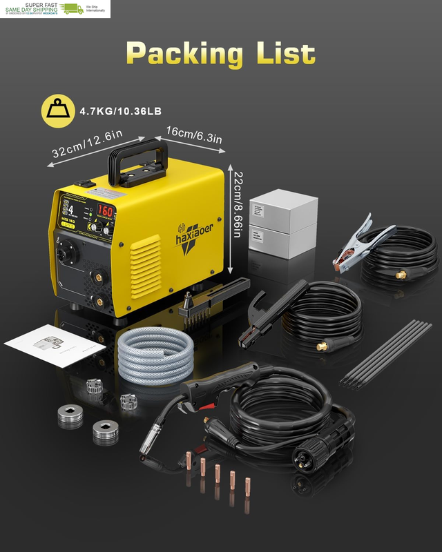 ?Extensive Welding Kit?: haxiaoer 4-in-1 MIG Welder includes 1X 2m ground clamp, 1X 2m welding handle clamp, 1X Gas welding torch/15AK 3m/5kg gas welding, 2X Conductive Nozzle 0.8mm, 2X Conductive Nozzle 0.9mm, 2X Conductive Nozzle 1.0mm, 1X 0.8/0.9K Wire Feeder Wheel, 1X 0.8/1.0V Wire Feeder Wheel, 1X 0.5KG/0.8mm flux cored wire, 1X 0.5KG/0.8mm solid wire, 5X Electrode ?2.0mm, 1X slag hammer, 1X 2m gas pipe, 1X English manual.