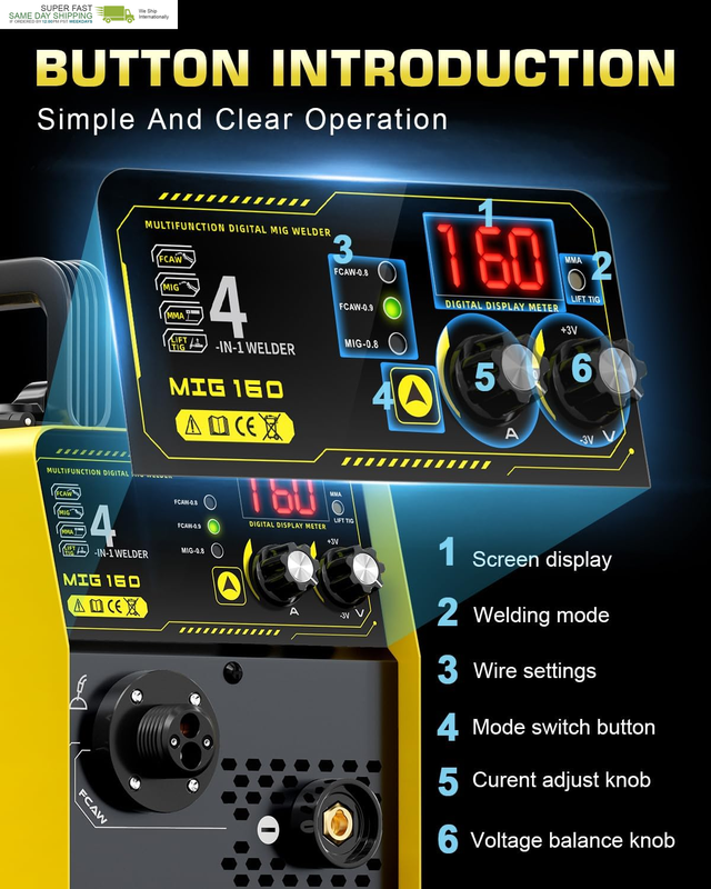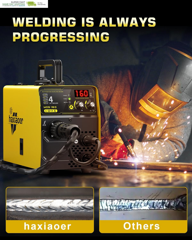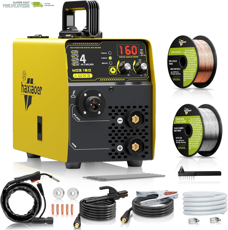 ?4 IN 1 MULTIFUNCTIONAL WELDING?:Gas MIG/Flux MIG/Lift TIG/Stick (MMA) WELDING MODE - All in one haxiaoer 160A Mig Welder. It can weld metals such as stainless steel and carbon steel from 0.6 mm sheet to 8 mm thick, making it ideal for automotive repair, farm equipment and metal arts. It also features a voltage control button that compensates for voltage for more stable welding.