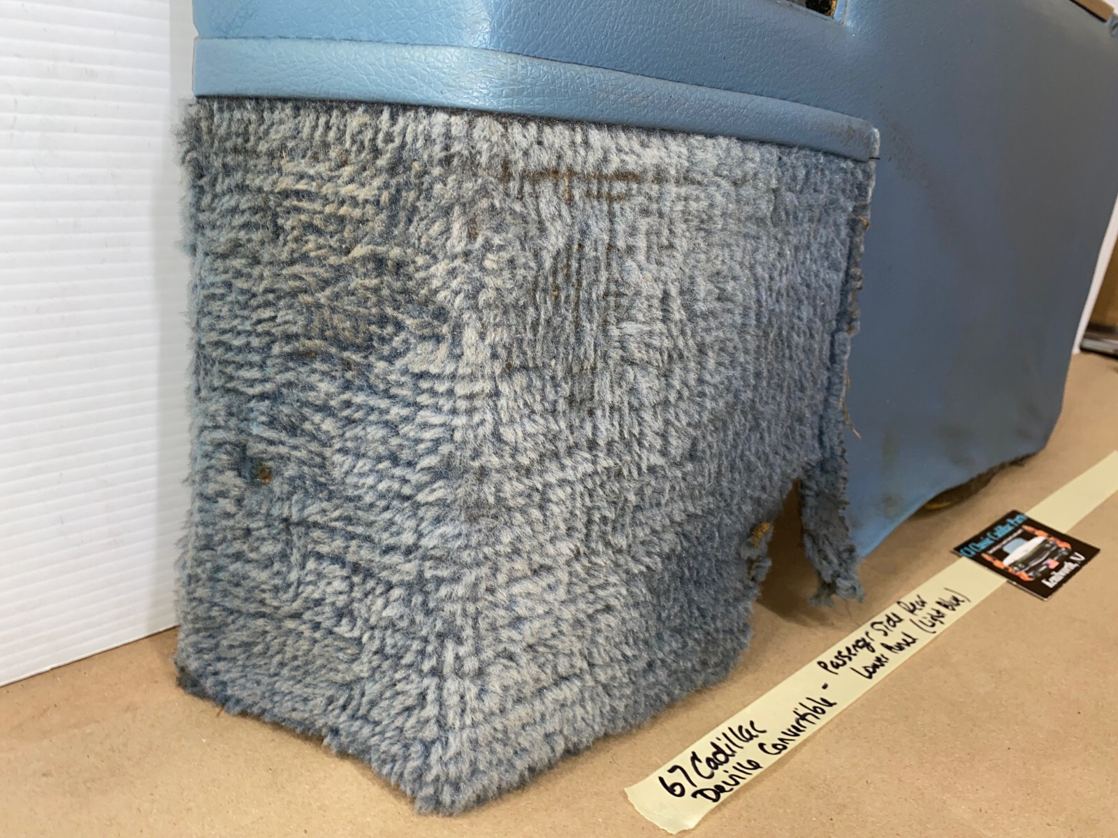 This OEM passenger side rear quarter lower door panel is in good driver quality condition. Black plastic backer is intact, no cracks, all mounting holes are intact. Vinyl is in good condition, no major rips or tears. Carpet is a little faded and a little brittle, but could always be recovered or re-dyed. This was