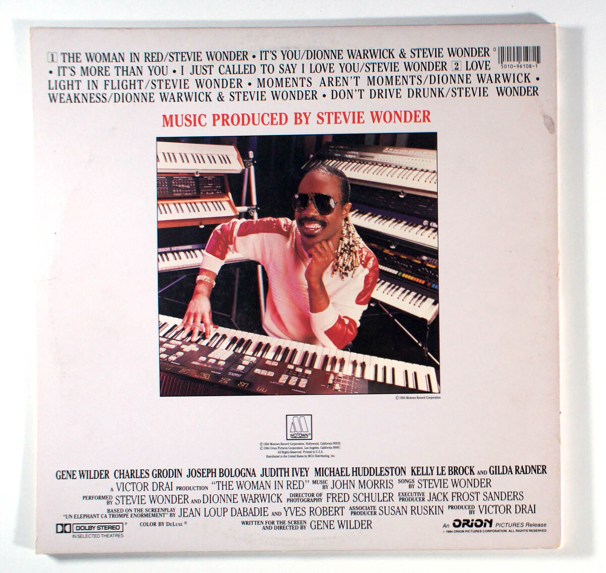 The Woman in Red is the second soundtrack album released by Stevie Wonder on the Motown label. Also featuring Dionne Warwick, the album was released in 1984 for the film of the same name (starring Kelly LeBrock). It features Wonder's biggest hit, I Just Called to Say I Love You, which hit No. 1 internationally and won the Academy Award for Best Original Song, and also features the follow-up hit, Love Light in Flight (a US top 20 hit) and Don't Drive Drunk, the song and the accompanying music video for which were used in the Ad Council and the US Department of Transportation's Drunk Driving Prevention public service announcement the following year. The album reached No. 4 on the US Billboard 200 chart, No. 1 on the R B Albums chart (for four weeks) and No. 2 on the UK Albums Chart, where it was kept off the top spot by the albums Now That's What I Call Music 3 and David Bowie's Tonight. However, the single I Just Called to Say I Love You, taken from The Woman in Red, was a massive hit in the UK, reaching No. 1 and becoming the second best-selling single of 1984 and the third most successful single of the entire 1980s there.