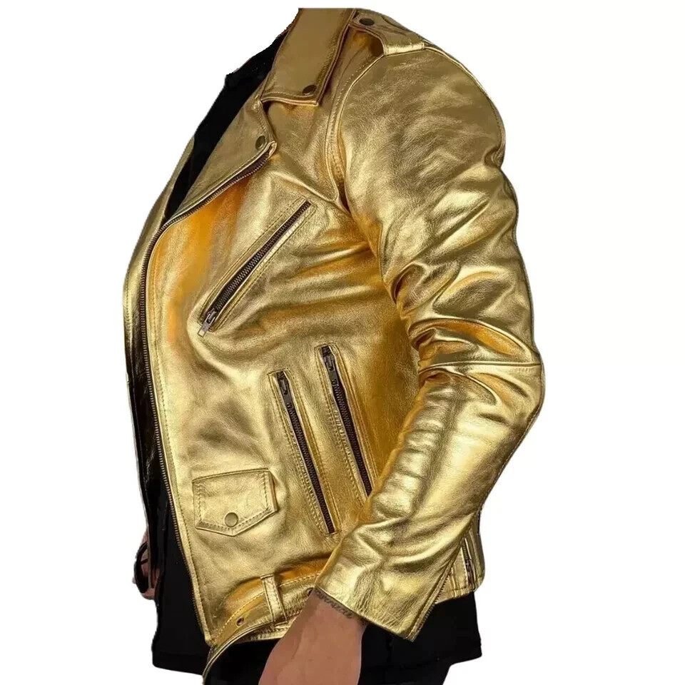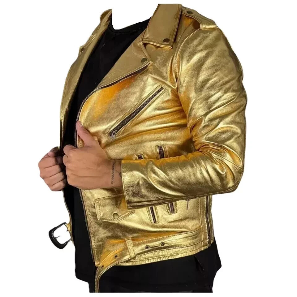 Stylish Motorcycle Men's Jacket Golden Leather Handmade Genuine Lambskin Soft