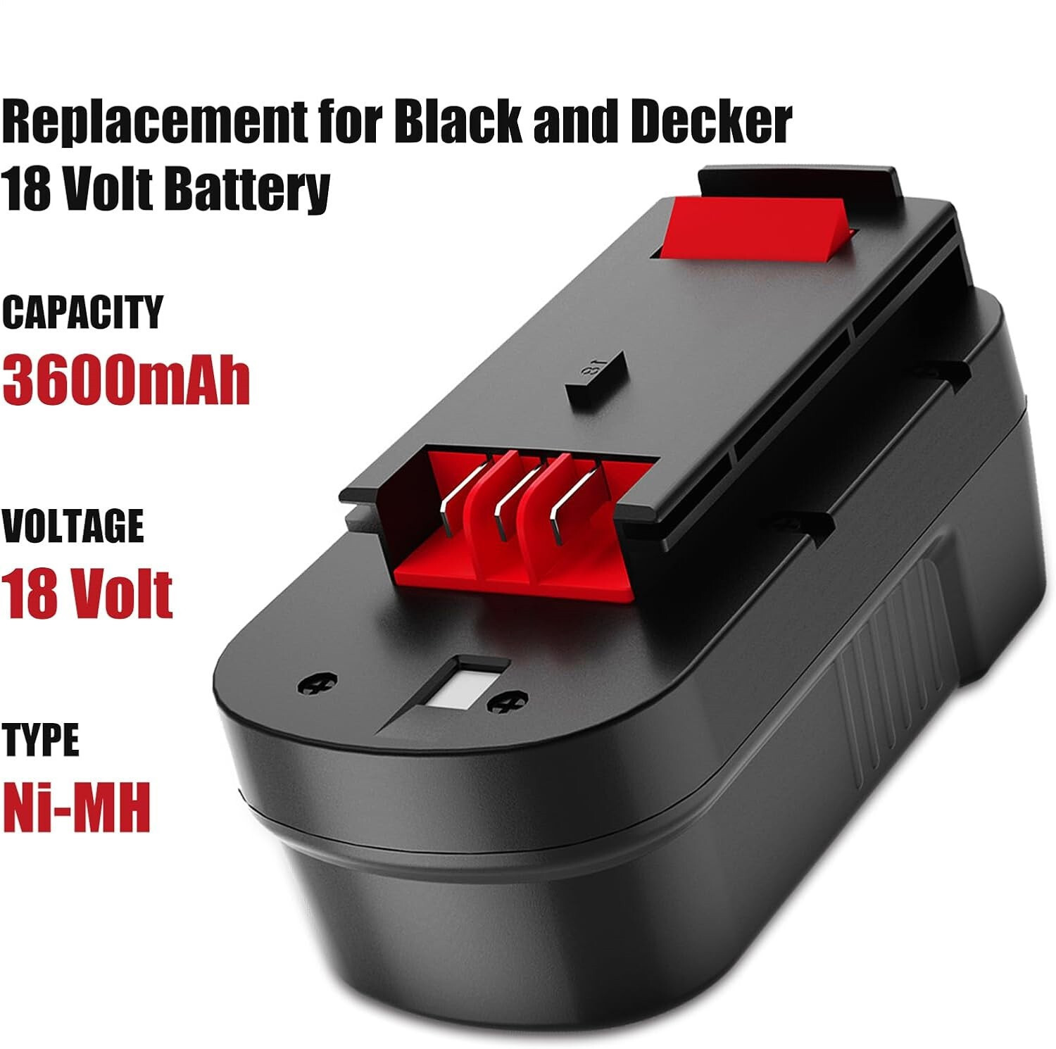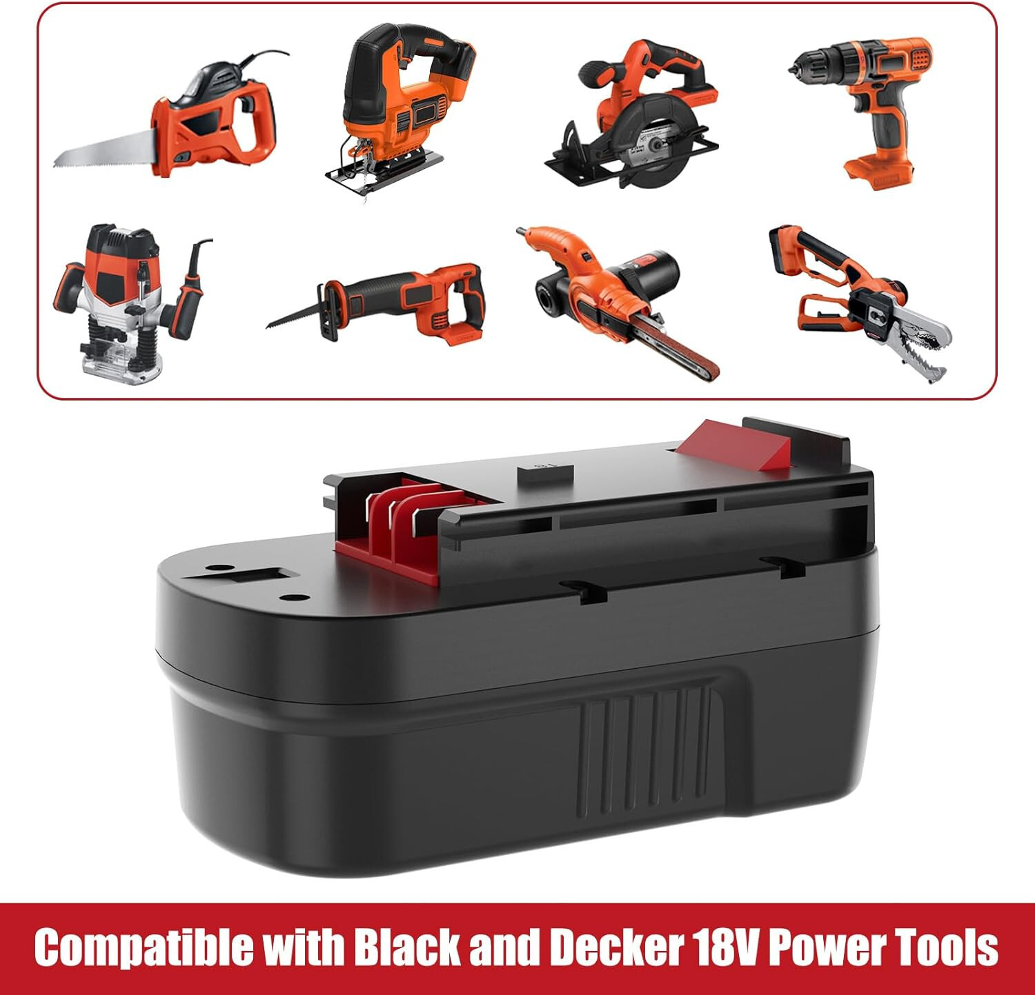 Replaces Black Decker battery models: HPB18, 244760-00, A1718, A18, A18E, FS18FL, FSB18, FS18ID, and more. Fits a wide range of 18V cordless tools including drills, hedge trimmers, and saws.