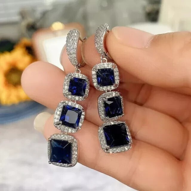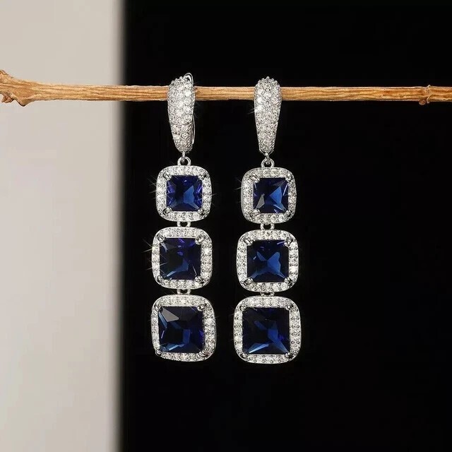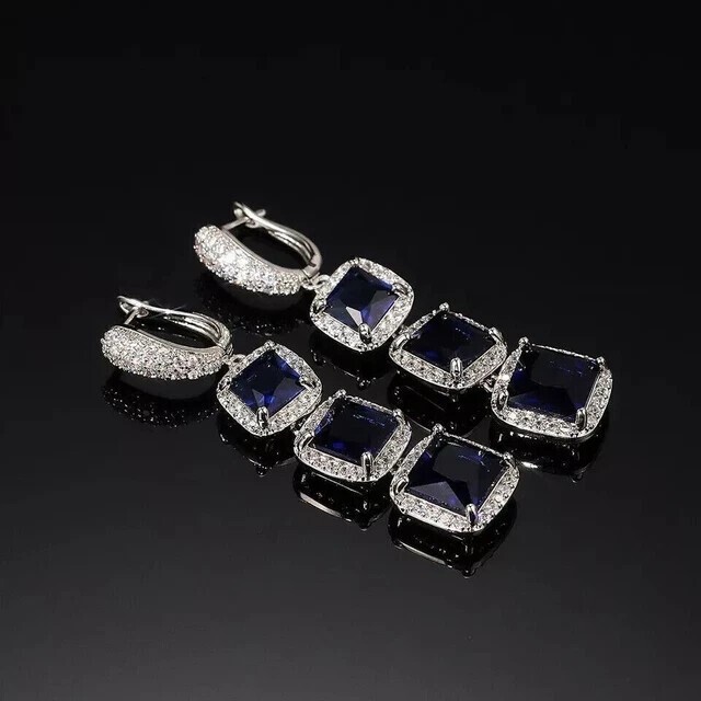 4Ct Princess Cut Lab Created Sapphire Drop/Dangle Earring 14k White Gold Plated