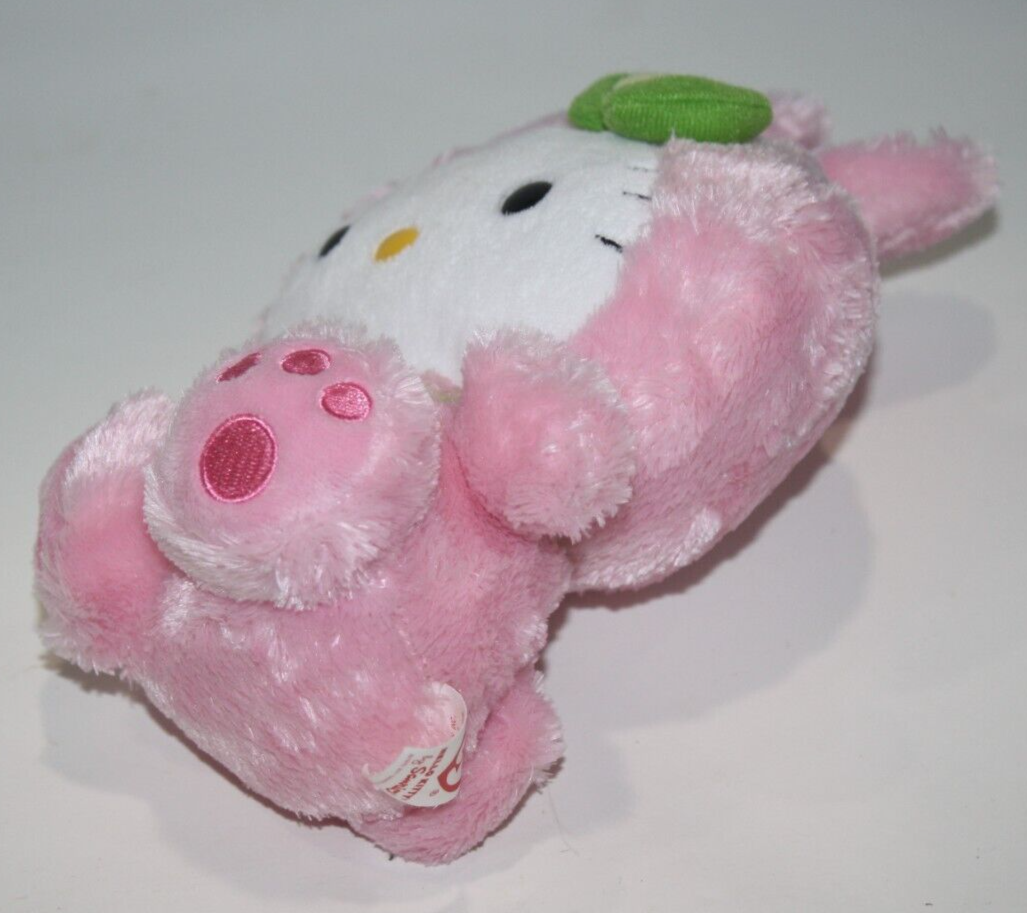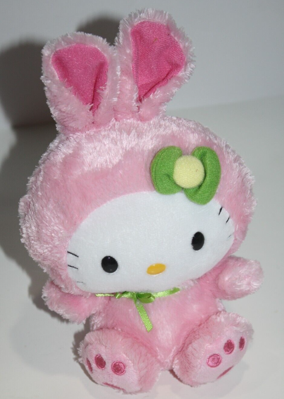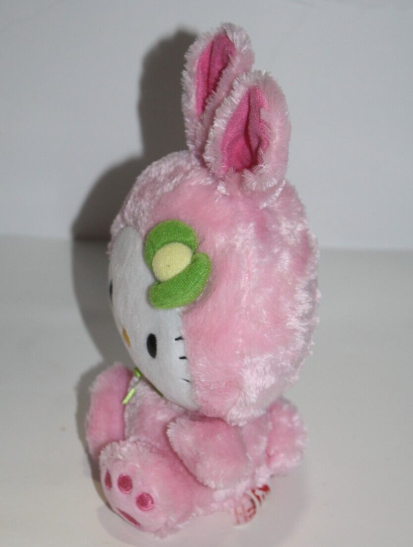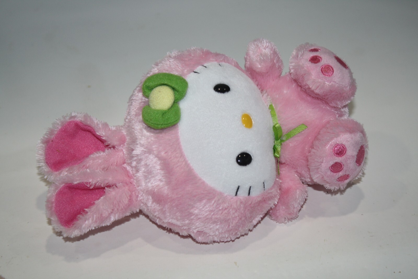 Soft White plush Hello Kitty, Wearing a Very Soft Pink Plush Bunny suit made into her body, Bunny suit and Hood are Not removable, Green bow is stitched to her head and wears a thin green ribbon neck bow, Plastic eyes and nose, Seam/Tush tag intact, Soft stuffed with some pellets in rump
