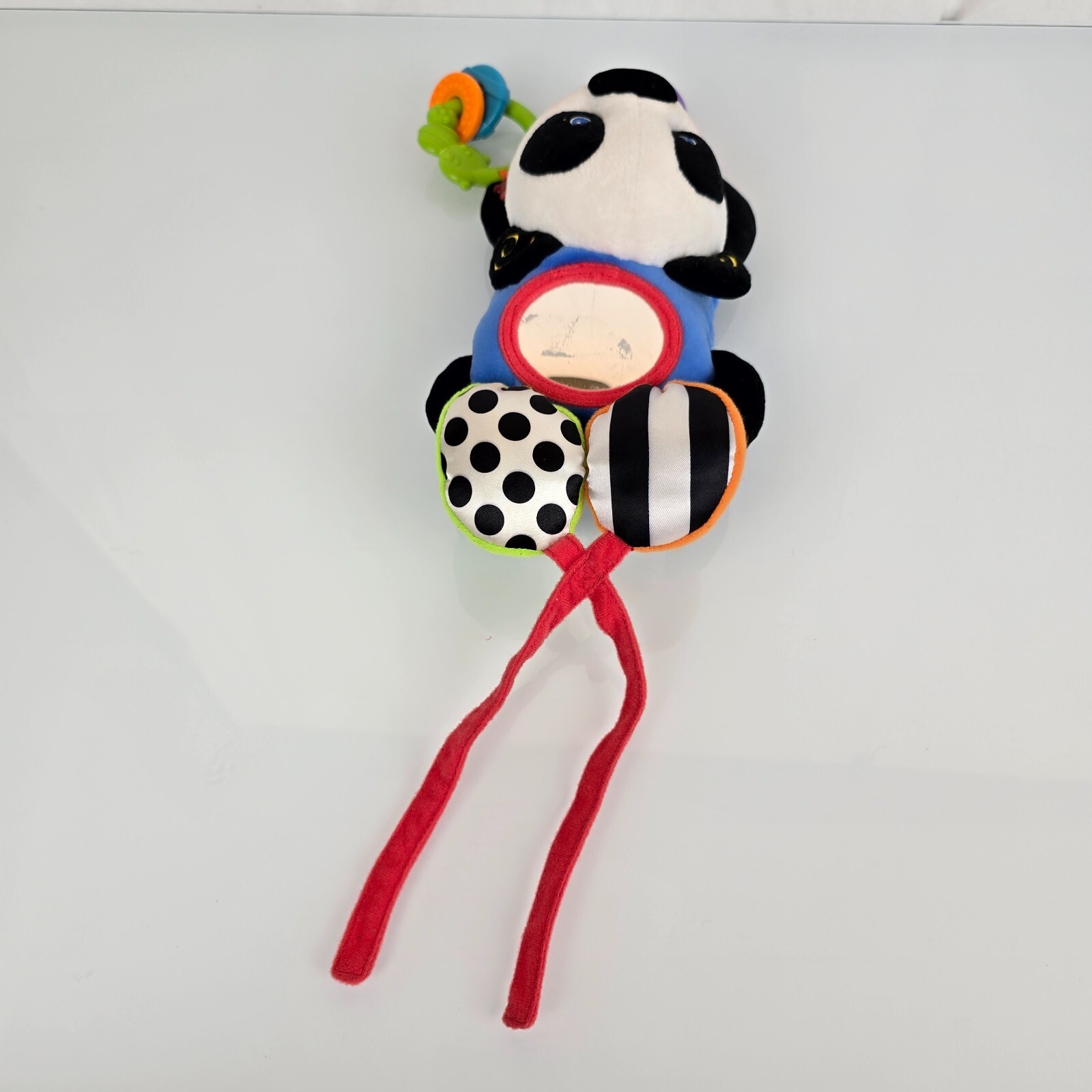 The Miracles Milestones Musical Panda is a toy that can go where ever baby goes and is developmentally appropriate for stimulating baby's sense of sight, sound and touch. It is a soft plush musical panda bear with a bold B W face, B W patterned feet, a big mirror for baby to gaze into, and embroidered ears and eyes. In one paw the Panda has a cute caterpillar ring with clackers for baby to bat at and pull. When baby pulls on the caterpillar the little lady bug light lens that sits on the Panda's paw lights up and music plays. The music features 3 developmentally rich tunes and a SFX (giggle). Attached to the Panda's other paw is a half purple, half clear spinner ball with beads. Two ties that attach to the panda's feet allow mom to tie him in various places such as a crib, car seat, stroller, etc., and his hanging orientation ensures that panda's friendly face always faces baby.