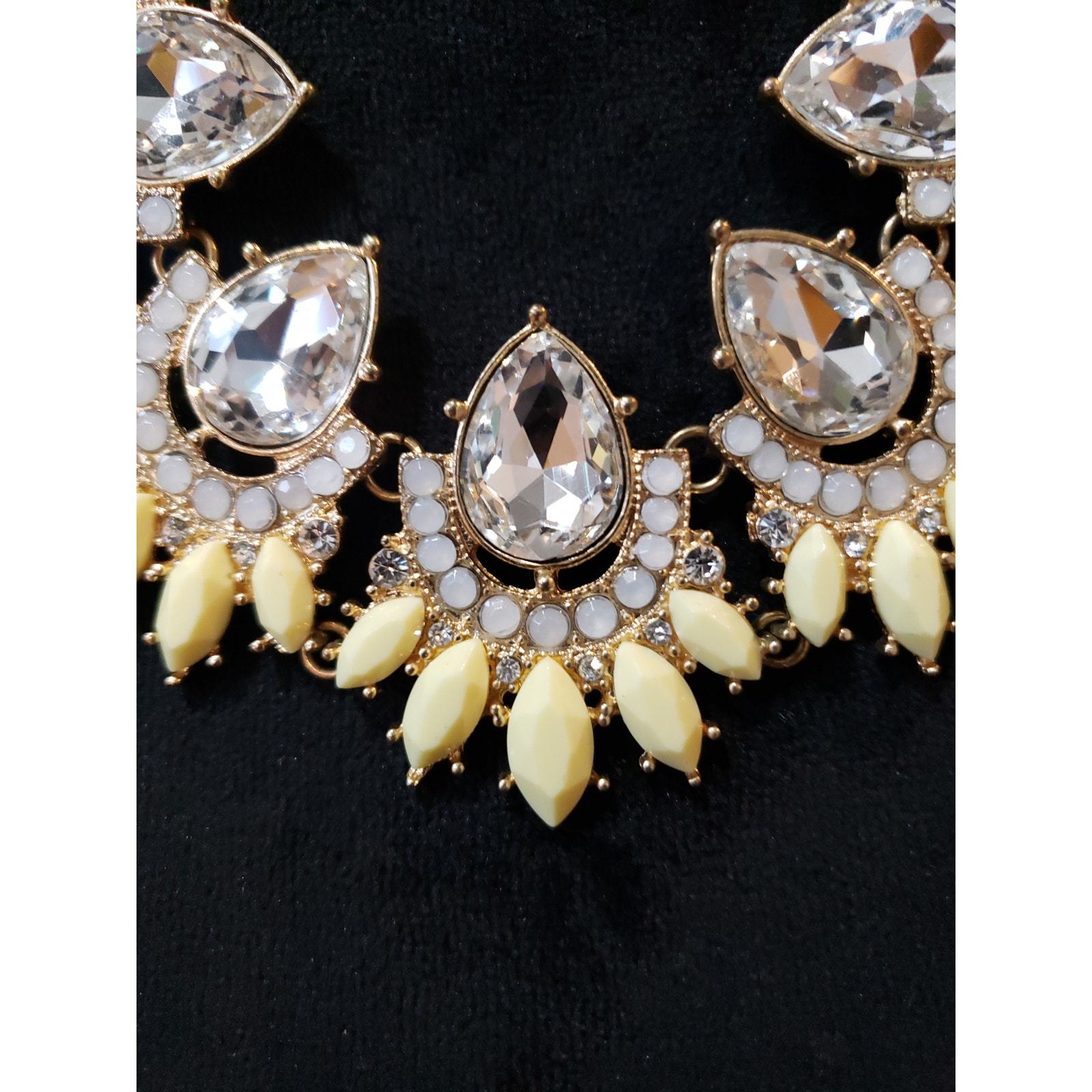 Women's Statement Necklace Gold Tone Crystal Teardrop Yellow White Floral Design