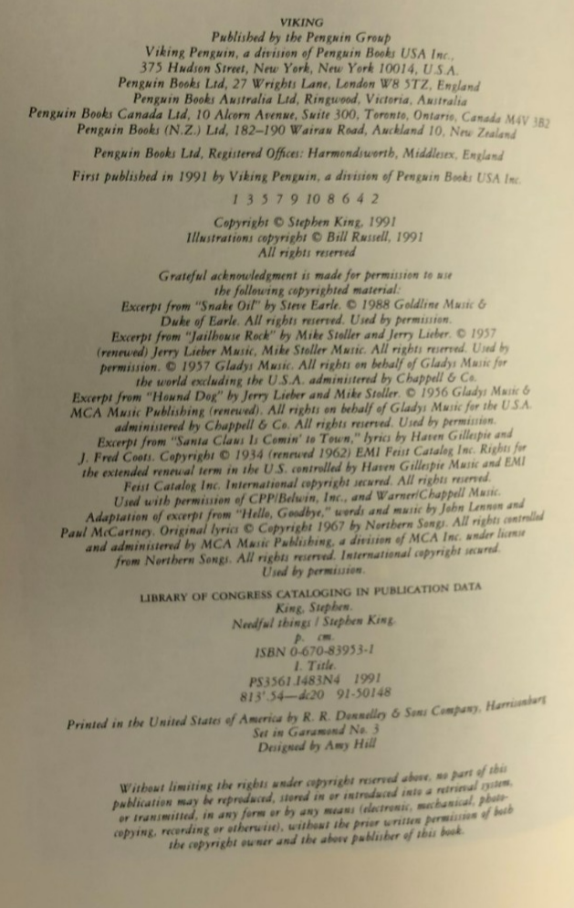 NEEDFUL THINGS the Last Castle Rock Story by Stephen King (1991) Viking HC 1st