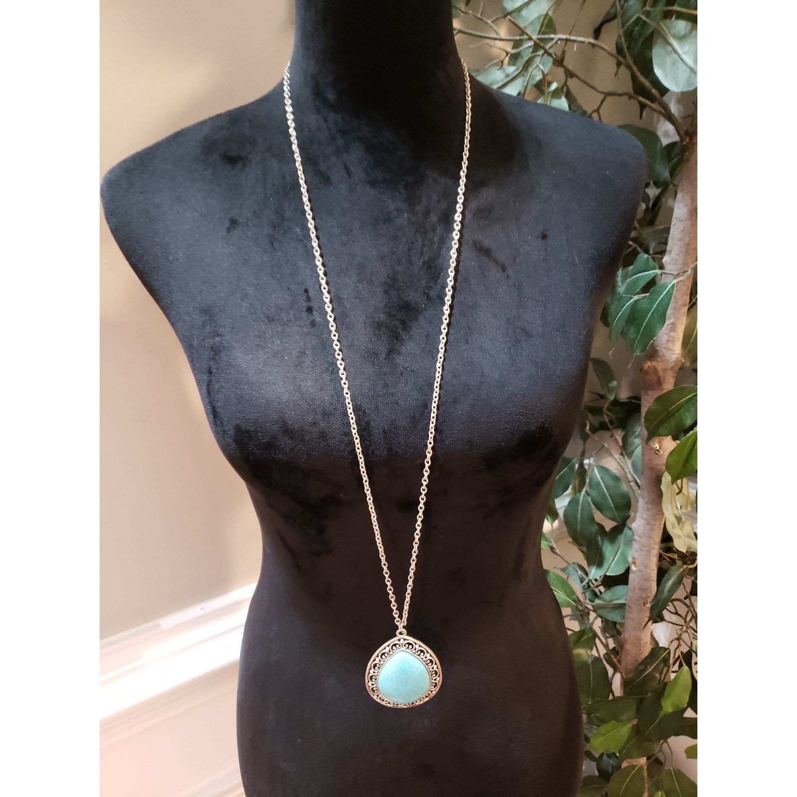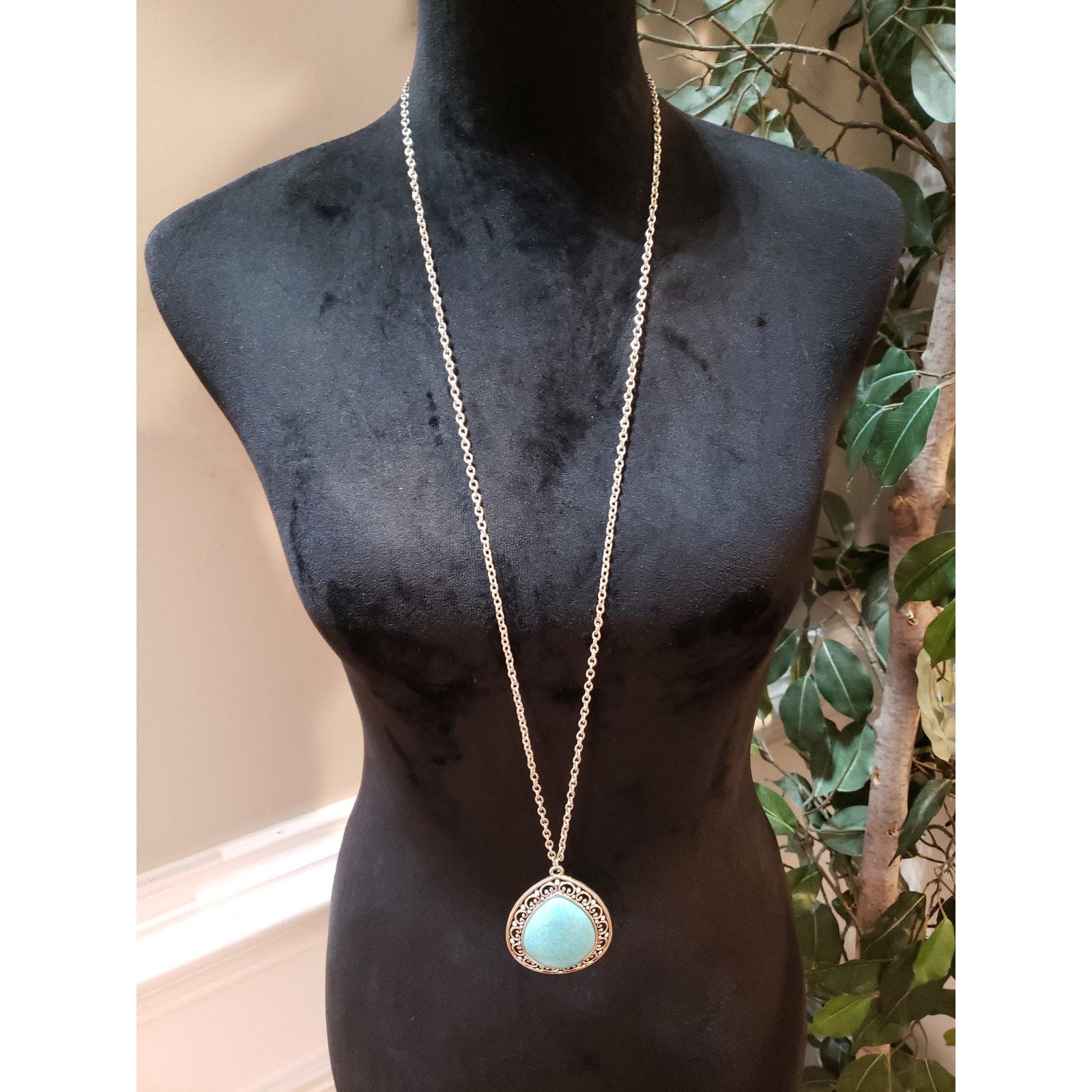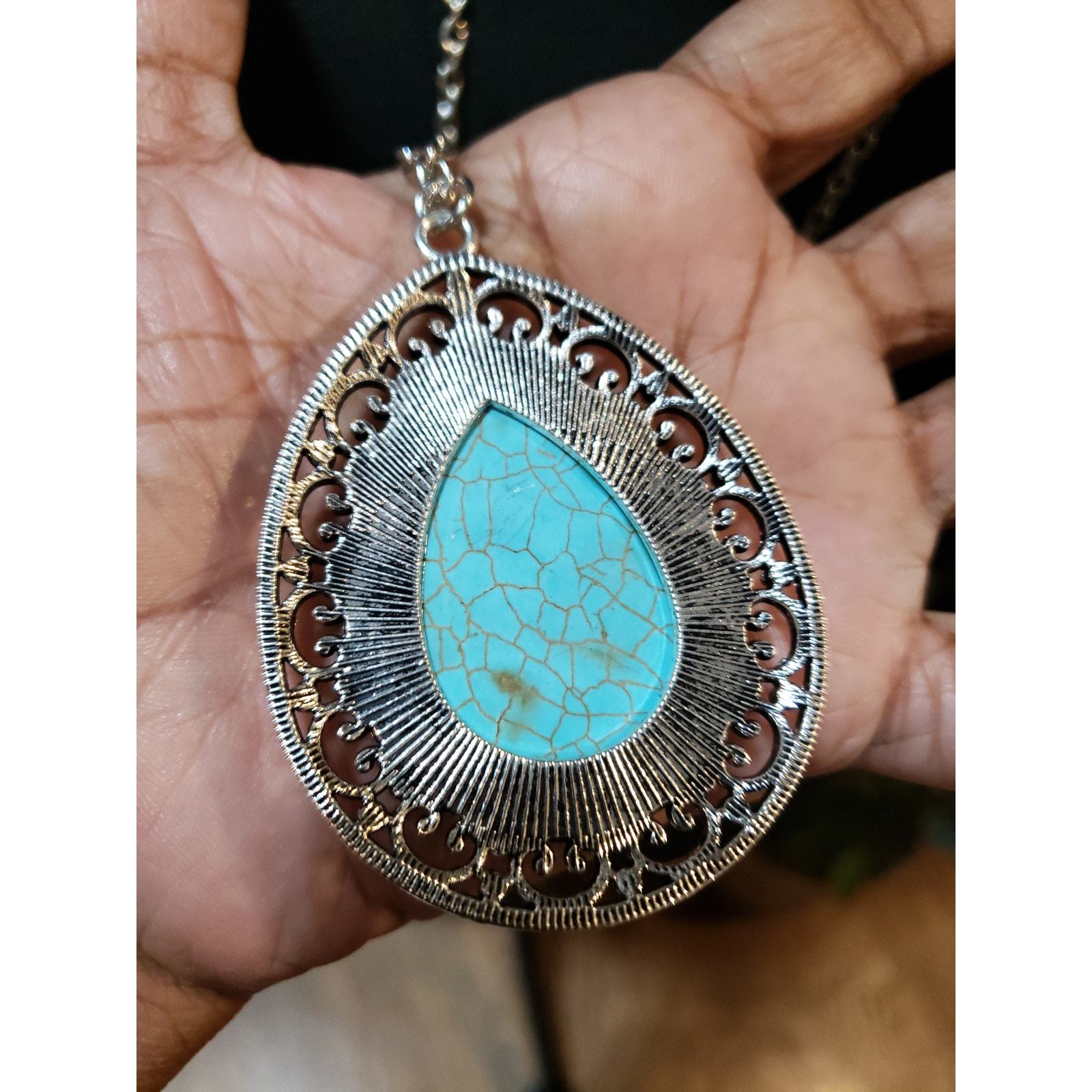 Womens Gold Tone Teardrop Turquoise Filigree Pendant Necklace with Cuff Bracelet.