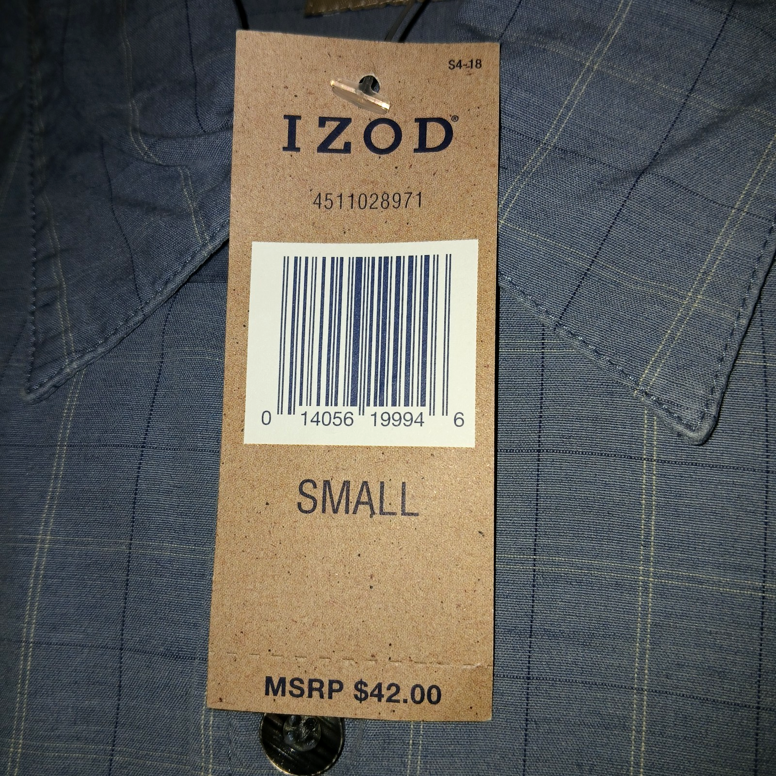 THIS IS A NICE MEN'S IZOD SHORT-SLEEVED 100% COTTON MUTED BLUE PLAID BUTTON-DOWN SHIRT IN A SIZE SMALL. IT IS NEW, WITH TAGS AND PRICE OF $42.