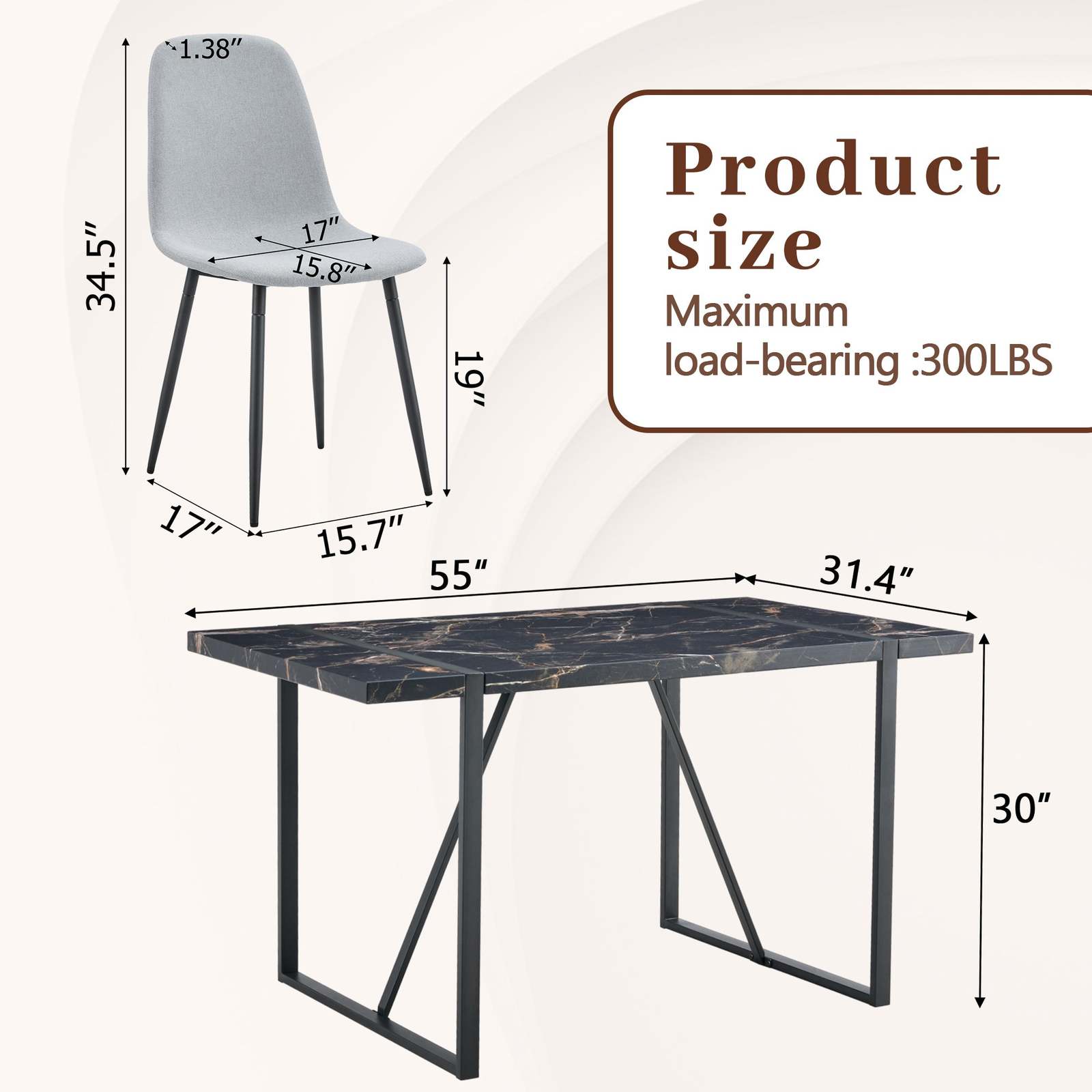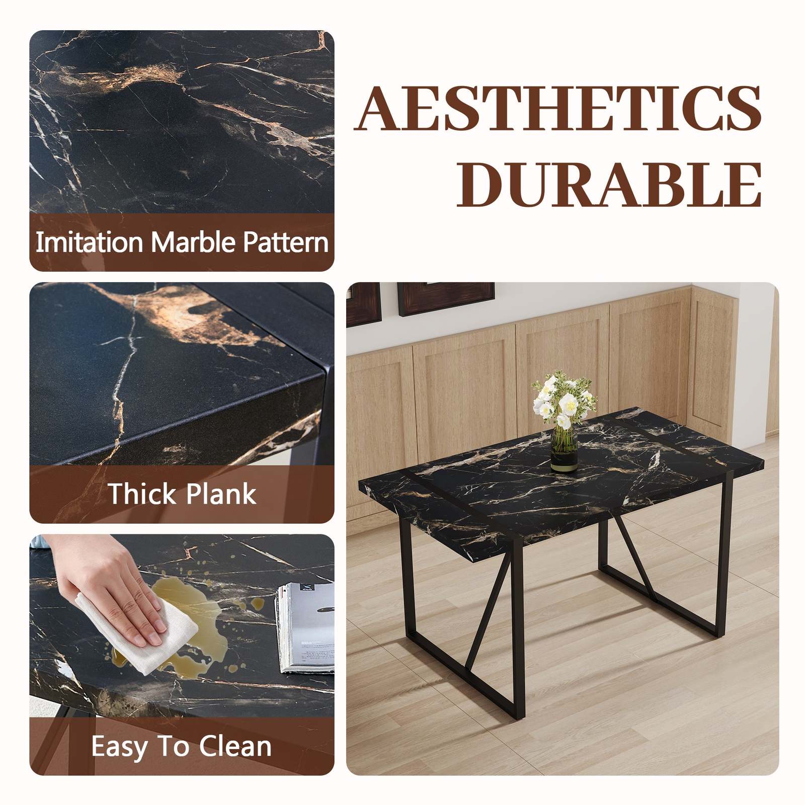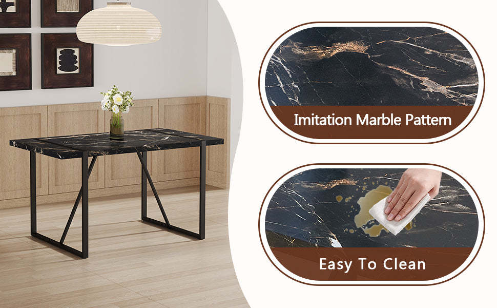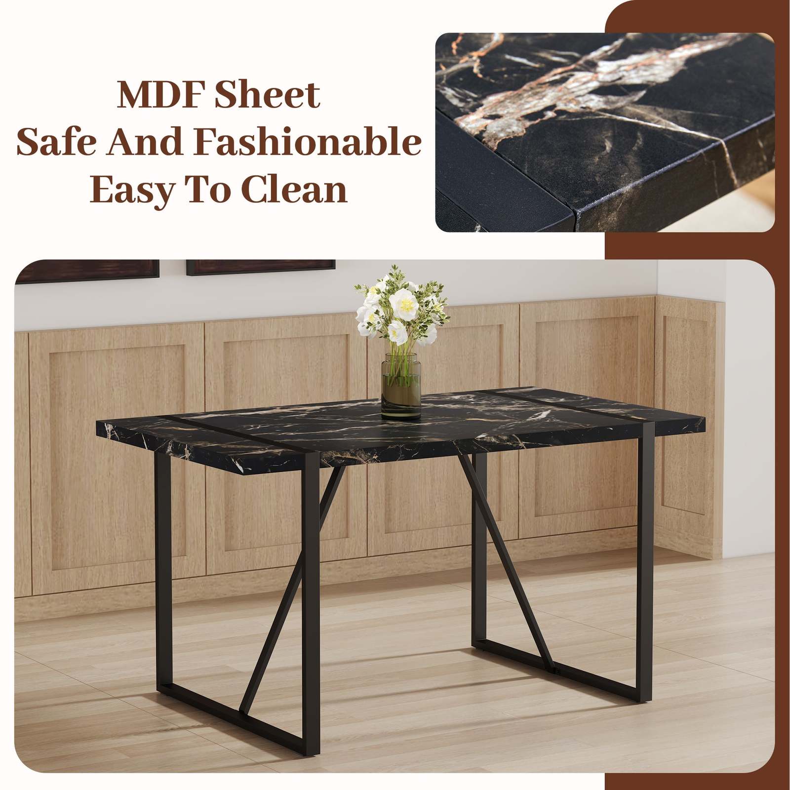 Black Marble Pattern Tabletop: The dining table is made of MDF material with a black marble pattern sticker, smooth edges for high safety.Inset Rectangular Metal Legs: The legs feature two rectangular black metal frames, inset within the table, tightly connected to the tabletop for stability.