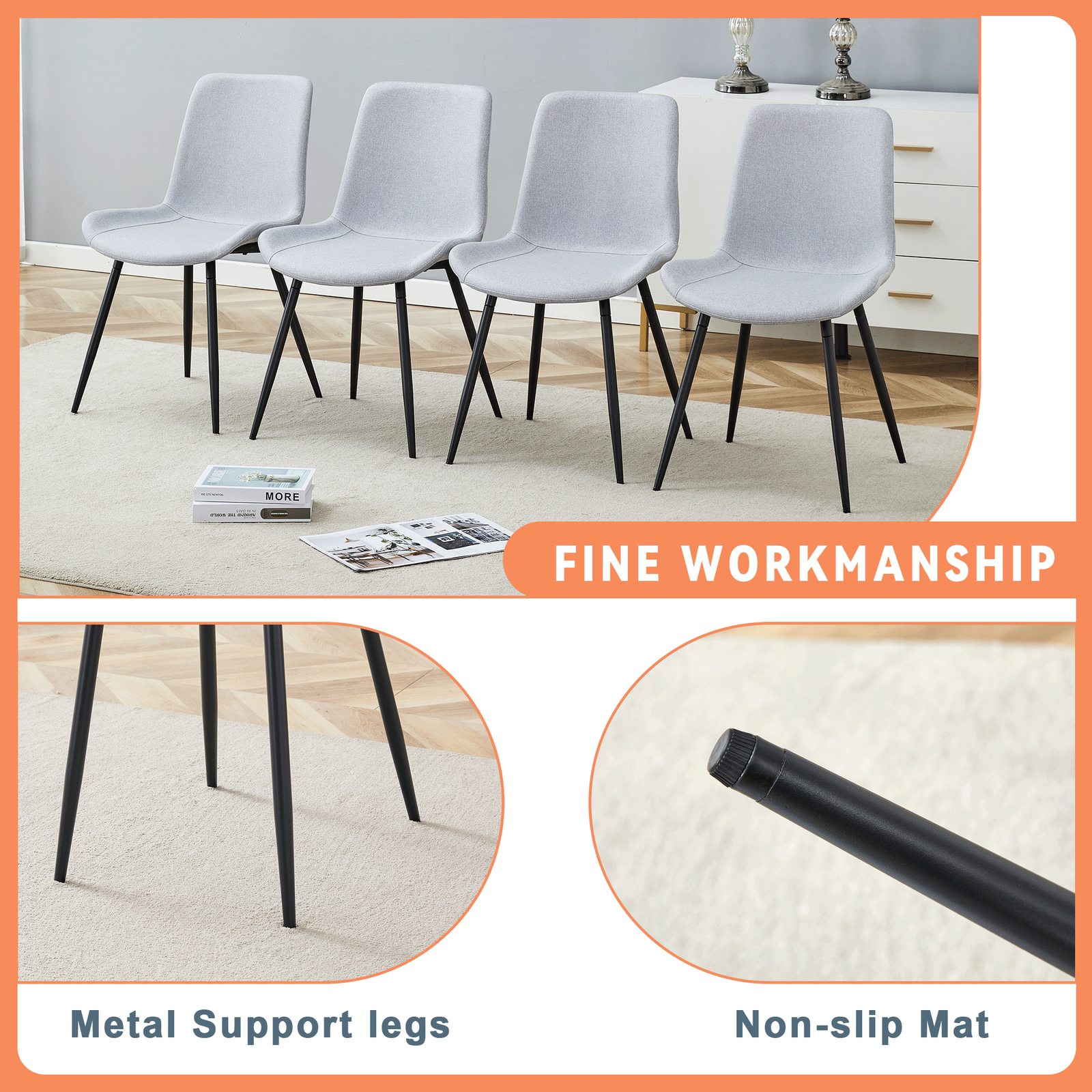 Light Grey Linen-Cotton Texture: The dining chairs are made of light grey linen-cotton fabric, with integrated seat and backrest design, solid color style, breathable and soft comfort,offering a warm and comfortable touch while presenting an elegant home atmosphere.Comfortable Experience: Thoughtful ergonomic design, ensure comfort during long periods of use.