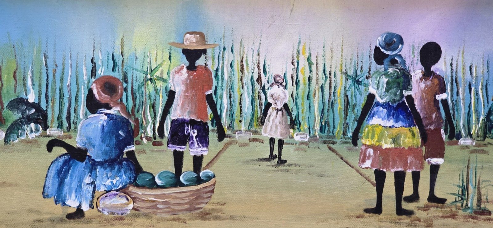 This medium-sized acrylic painting on canvas captures the rustic beauty of the Haitian countryside, invigorating the senses with its rich portrayal of nature and the everyday life of its people working/harvesting in the sugarcane fields. Domeck's one-of-a-kind masterpiece, complete with his authentic signature, anchors itself as a focal point of any collection.