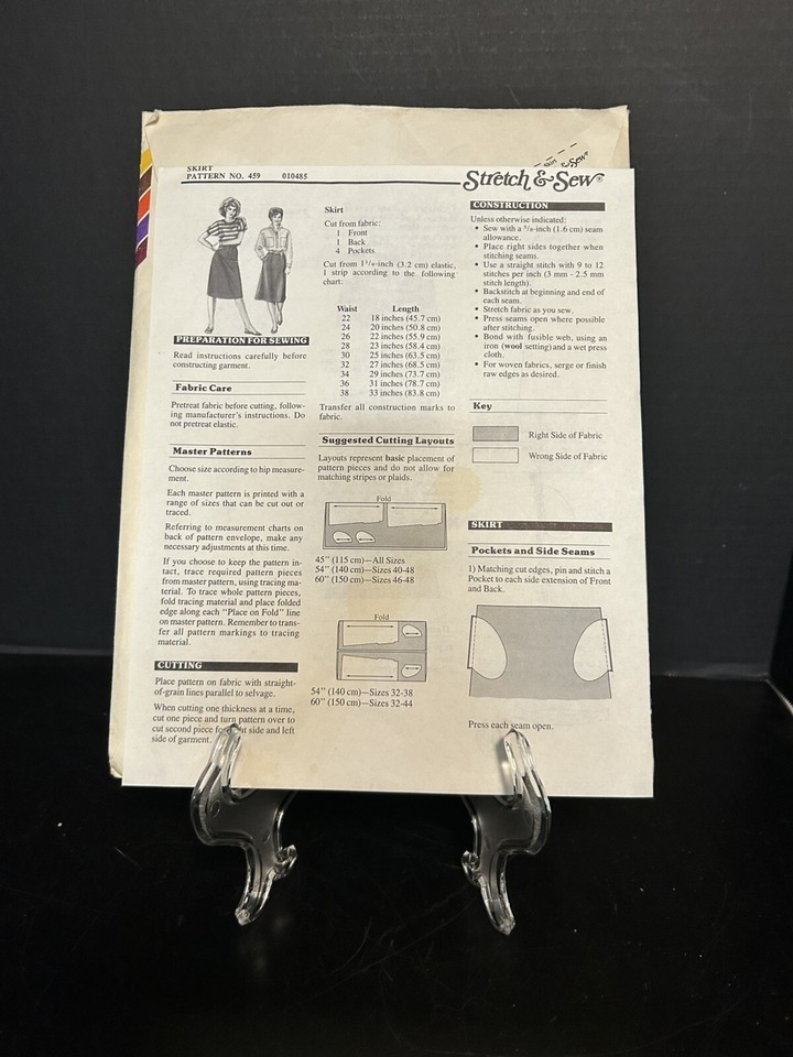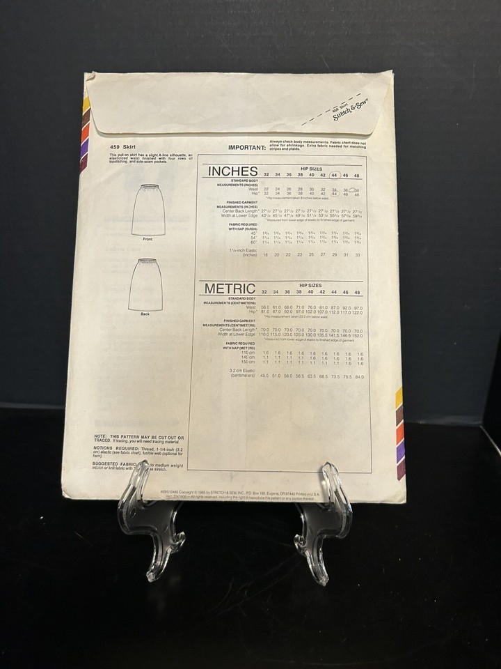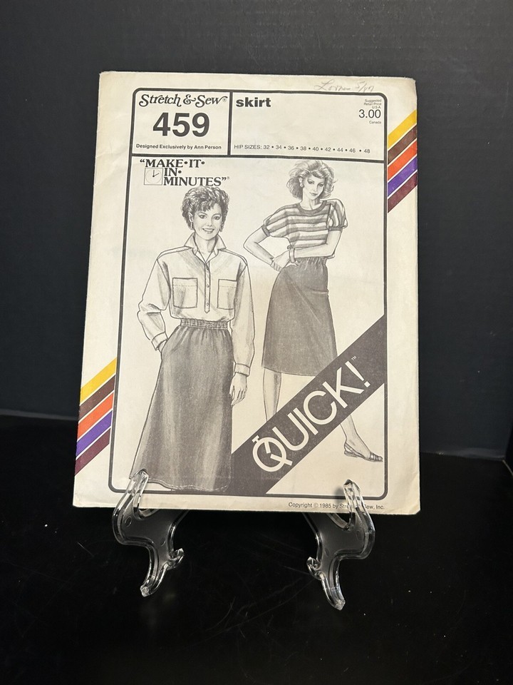 Craft your own unique fashion with the vintage Stretch Sew Pattern 459, a classic piece from 1985 designed by Ann Person. This uncut, factory-folded pattern allows you to create a stylish skirt tailored to your exact measurements, with size compatibility ranging from a waist of 32 inches to 48 inches.