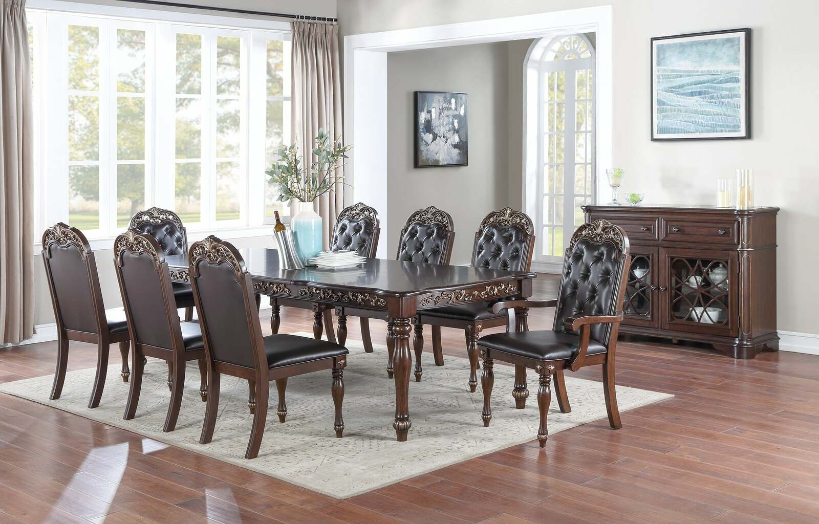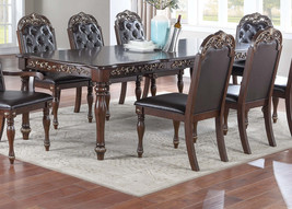 Classic and extravagant, this formal dining set is what you need for your dining space. This set is designed to cater to dinner parties or large family gatherings. Perfect for bigger groups and special occasions like thanksgiving and Christmas. With the button tufted design an bold framing, the chairs upholstered with extra cushions.