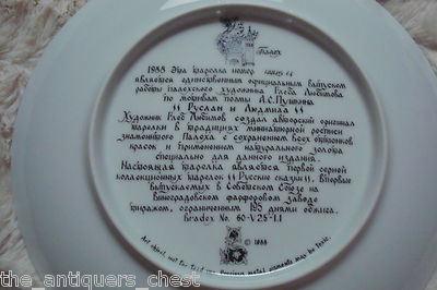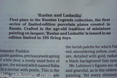 Russian Leyends Collector Plate "Ruslan and Ludmilla" original box, signed, excellent condition. Marked used but probably new, from a closing store. Exquisite Example of Russian Art these 7 1/2" Limited Edition Collectors Plates were created in Russia, based on Russian laquer art and issued in an edition limited to a maximum firing period of 195 days - Minimum of 16 ceramic pigments used on theses hard fired porcelain plates. [a4-rack1-c] WITH CERT NO BOX