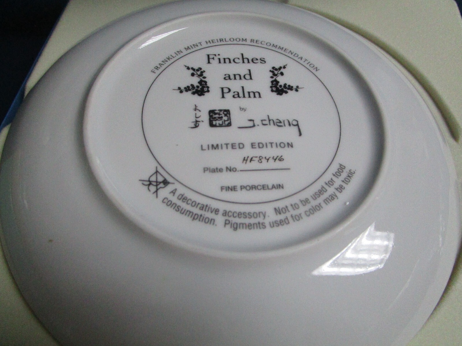 The FRANKLIN MINT HEIRLOOM "Finches and Palm" RECOMMENDATION by -Signed J. Cheng lim. edit. 8" diam. Trimmed in gold, fine porcelain, rich colors excellent condition, no cert [a4rack1TOP]