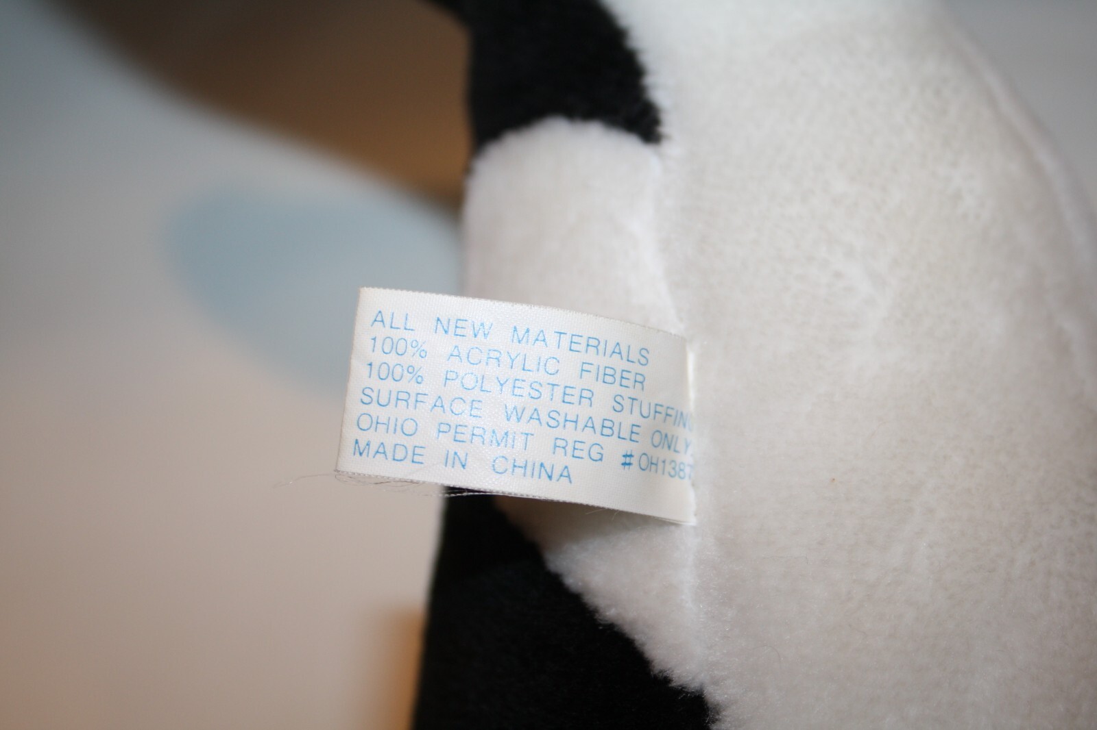 Black, White Soft Plush material, Blue plastic Eyes, Soft Stuffed with no beans/pellets, Seam/Tush tag intact