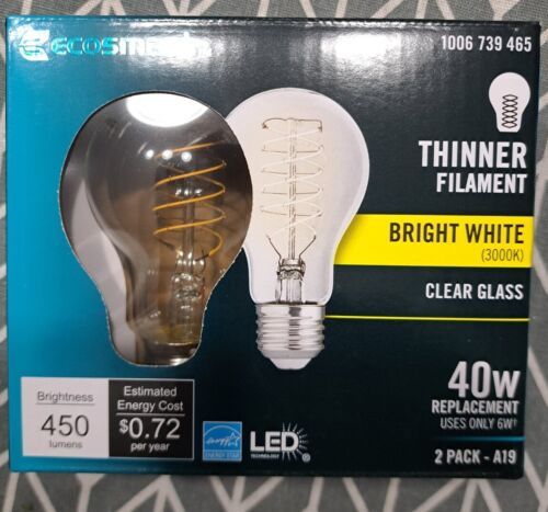 Ecosmart 40W A19 bright white 3000k Thinner Filament Clear LED Bulb 2 Pack