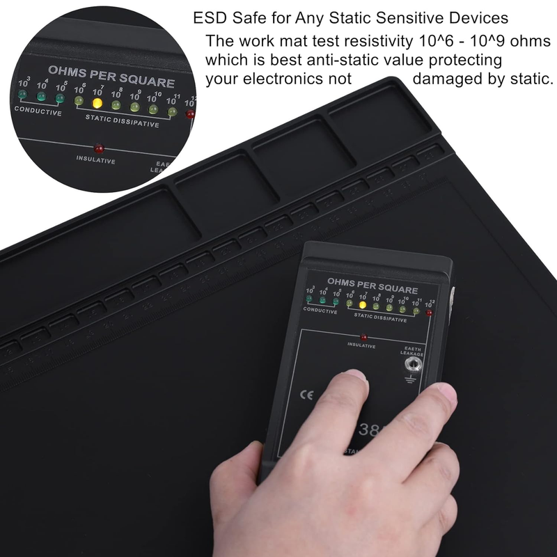 ??? An Ideal ESD Safe Mat ? - This high quality ESD soldering mat is designed for a better and safer work surface for electronics assembly and repair or soldering, such as for cellphones, computer, tablets, Laptop, iPad , IC circuit boards etc, especially for static sensitive electronic products, our anti-static mat can protect your sensitive electronic devices from static damage. The surface resistivity is between 10 ^ 6 and 10 ^ 8 ohms.