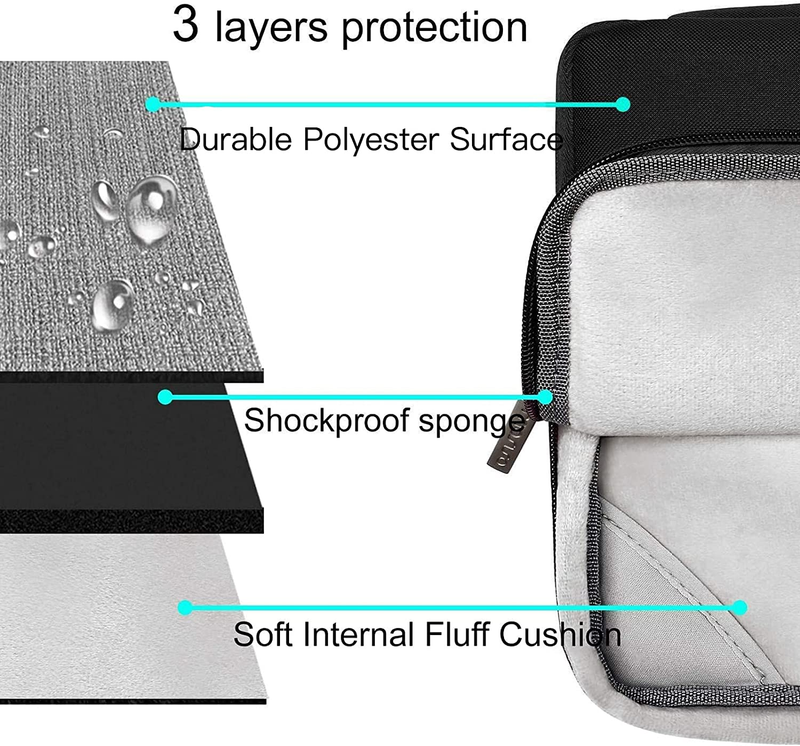 The 360 degree protective shockproof laptop sleeve with handle carrying bag internal dimension: 12.6 x 0.79 x 8.66 inches (L x W x H); external dimension: 13.19 x 0.79 x 9.25 inches (L x W x H). The front side pocket dimension: 10.8 x 6.5 inches (L x W). Made of polyester material, protect your laptop against accidental spills. Slim and lightweight, does not bulk your device up and can easily slide into your briefcase, backpack or other bag. Ideal for business, daily and travel.