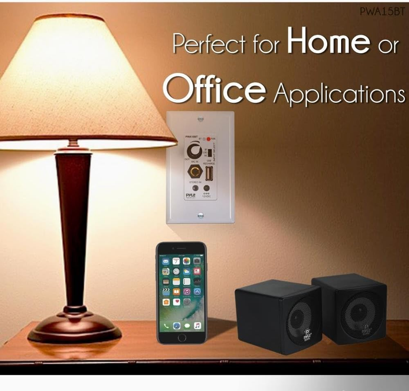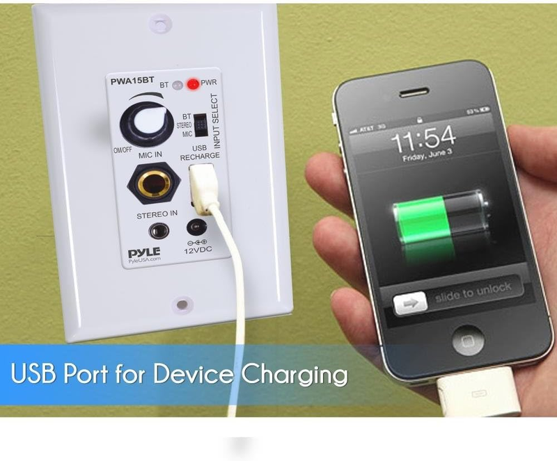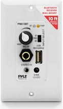 Control Bluetooth wireless music streaming in any room with the Pyle In-Wall Amplifier System. This wall plate receiver adds convenient microphone paging ability along with simple source audio control. Install the system on any wall in the home or office to unlock versatile sound configuration that is easily accessible. Built-in Bluetooth allows you to stream music to a connected intercom or speaker system hassle-free. Enjoy features like rotary control volume adjustment, 1/4'' mic input, USB port for device charging -- along with an Aux (3.5mm) audio jack for connecting and streaming audio from external devices. The rear panel speaker terminal block allows you to connect the receiver to a pair of speakers. Universal standard size gang plate fits most deep electrical boxes and allows for a clean installation. Add convenient audio control with the Pyle PWA15BT In-Wall / Wall Plate Bluetooth Audio Control Receiver.