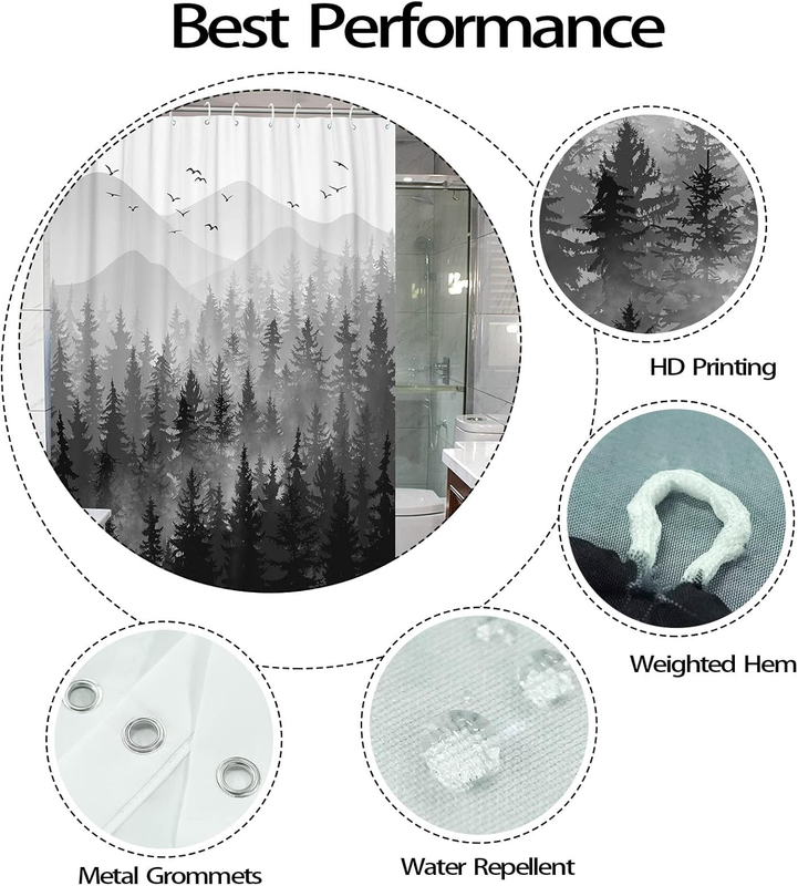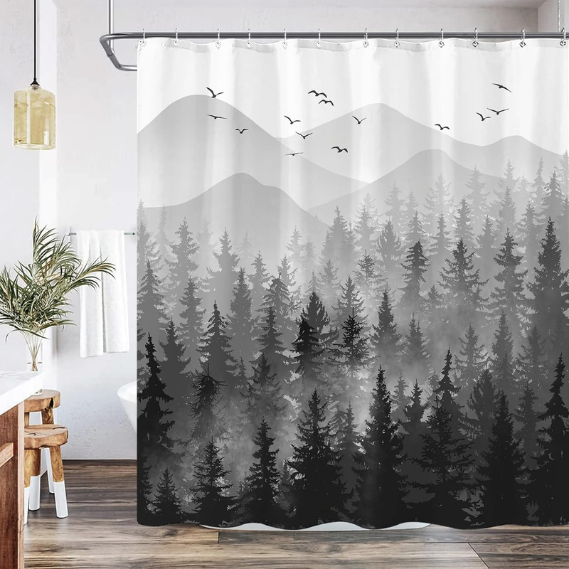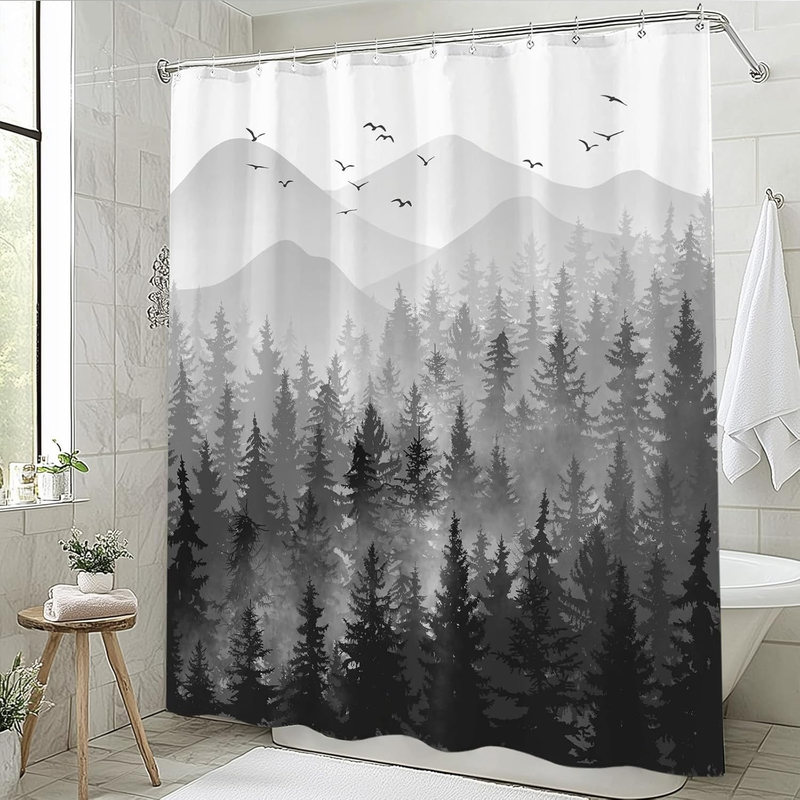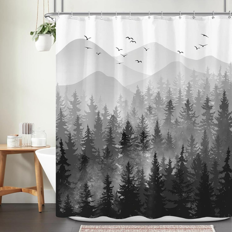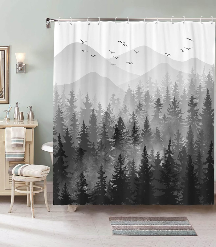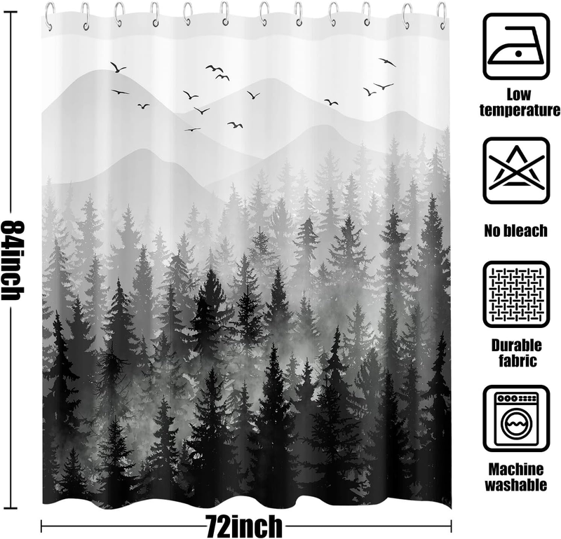 84 Inch Black and White Misty Forest Shower Curtain Set Grey Gray Ombre