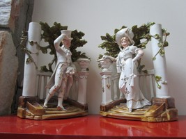 1900S DEPOSE FRENCH PAIR BISQUE SCULPTURE BUD VASE COUPLE IN STAIRS 10 1/2"