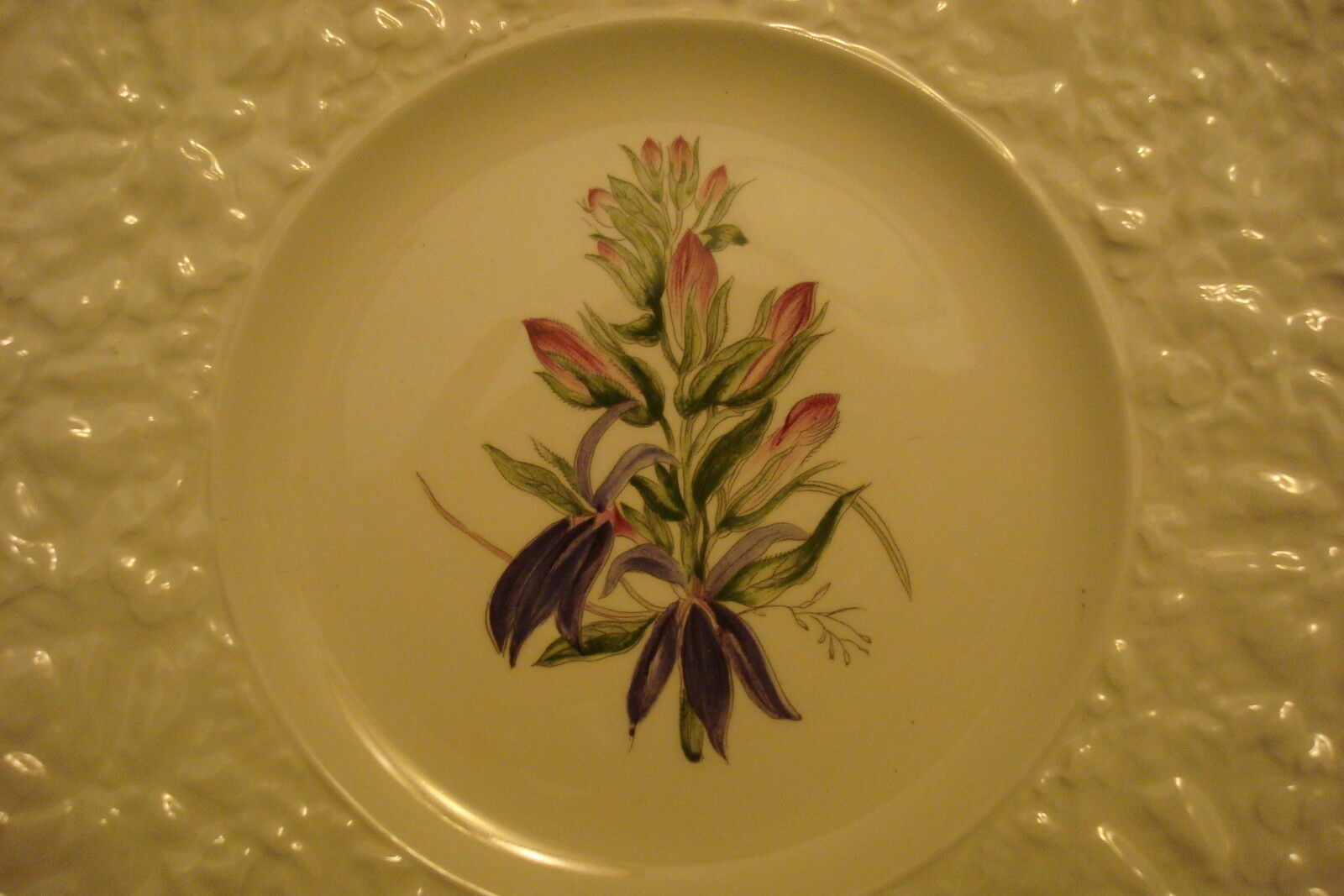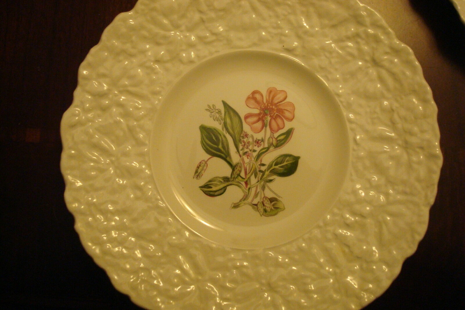 made in England, 9 1/4" plate, white molded border with a flower in the