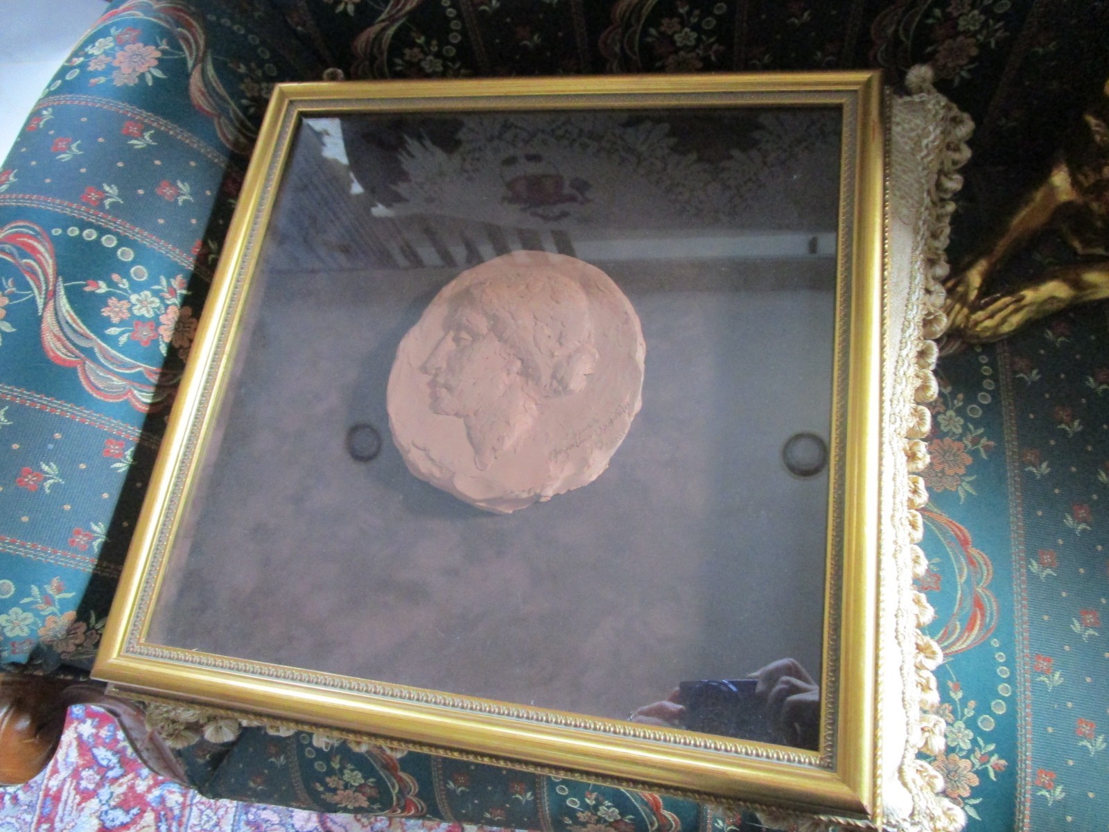 Andre Huguenin-Dumittan (1888-) SCULPTURE IN TERRE MEDALLION IN SHADOW BOX, FACE OF A WOMAN, DATED 1929, MEDALLION IS 6" DIAM, FRAME IS 16 X 16" VERY GOOD CONDITION, SOME LIGHT SURFACE SCRATCHES IN THE FRAME COMMENSURATE WITH AGE