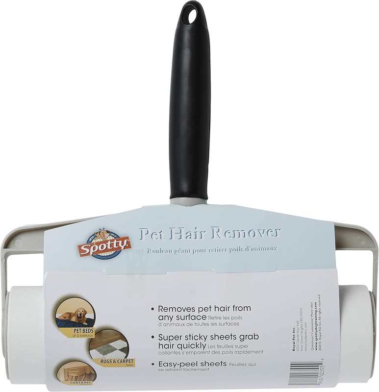 Pet hair? No problem! The versatile Spotty Jumbo Lint Roller from Royal Pet has super sticking adhesive sheets that remove pet hair from curtains, carpet, furniture and more. With an easy-to-hold handle, this lint roller is easy to use ? just peel, roll and let the sticky sheets do all the work. This roller has 30 feet of 60 sheets measuring 4.5" tall and is easy to refill! Refills sold separately.