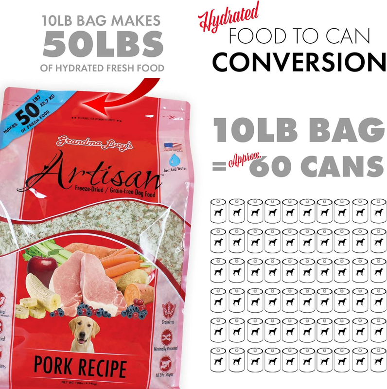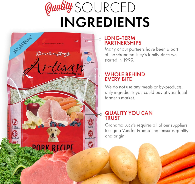 We believe that your pet deserves the same great quality of food as you do. Grandma Lucy?s approach is solution based feeding with every single ingredient in our Artisan Freeze-Dried Pork Dog Food is chosen with a specific benefit in mind. All of our recipes are Freeze-dried, inspected for quality and prepared in small batches at our family-owned facility in California. Artisan is a fantastic combination of digestibility and palatability making it a perfect way to introduce natural feeding into your pet?s diet . This all-natural, grain-free recipe is an ideal choice for a dog with food sensitivities or a picky eater.