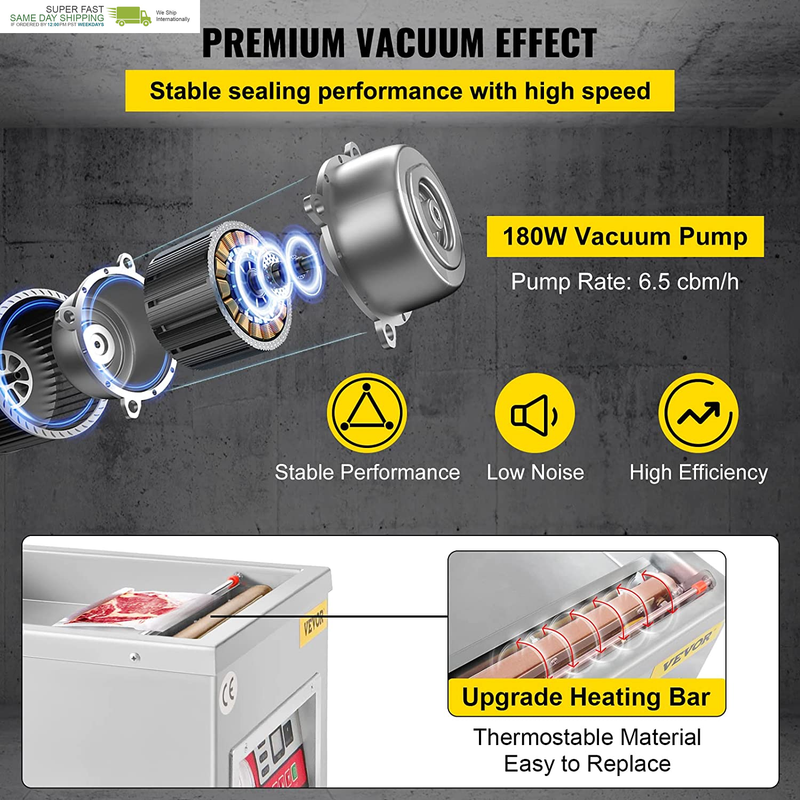 Vacuum Pump Rate: 6.5cbm/h. The vacuum sealer adopts a powerful vacuum pump and premium electric components, which has an excellent sealing effect for packing effectively and efficiently.