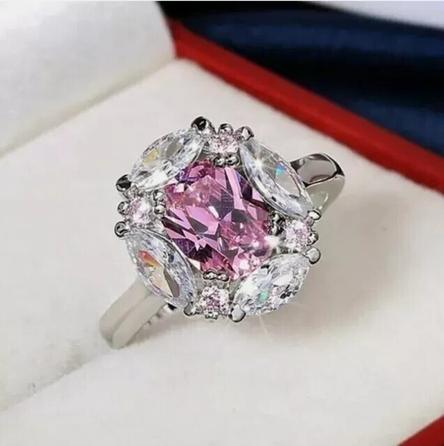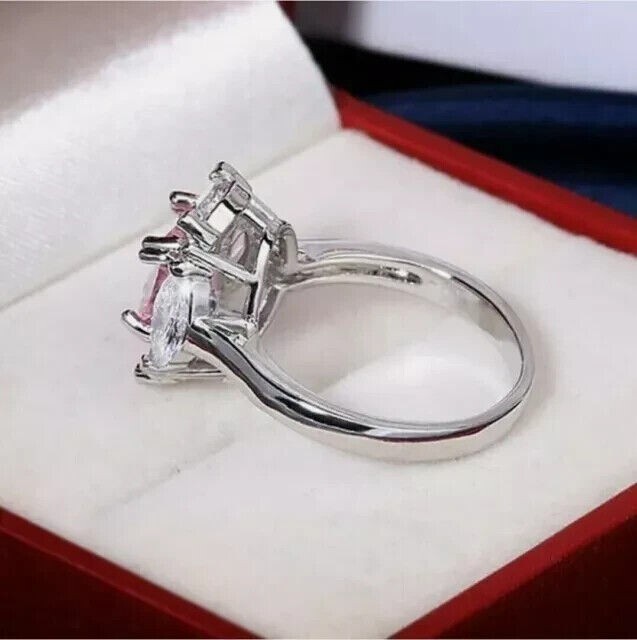 4Ct Oval Cut Lab Created Pink Sapphire Halo Engagement Ring 14K WhiteGold Plated